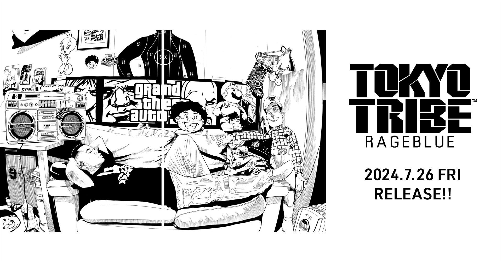 「Play fashion!」をミッションに掲げ、”グッドコミュニティ共創カンパニー”を目指す株式会社アダストリア(本部:東京都渋谷区渋谷2-21-1、代表取締役社長:木村 治)が展開する「RAGEBLUE(レイジブルー)」は、90年代ストリートを軸にしたコラボレーションの企画を3週連続リリースすることを発表いたしました。第1弾のクラフトバーガー専門店「JB’s TOKYO」に続き、今回発表となる第2弾の企画は、人気漫画「TOKYO TRIBE(トーキョートライブ)」とのコラボTシャツを1型3色展開にてラインアップします。2024年7月26日(金)から「RAGEBLUE」の限定12店舗と公式WEBストア .st(ドットエスティ)、ZOZOTOWNにて発売いたします。
