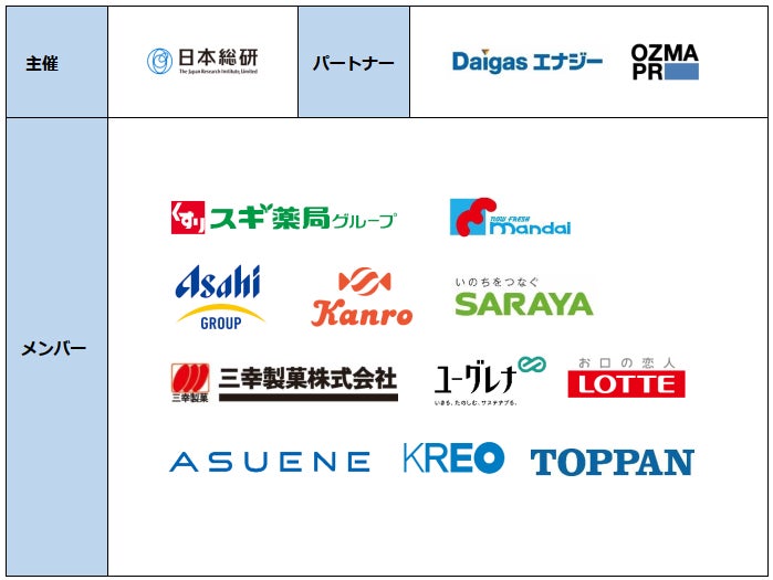 日本総研は活動全体の主催者としてコンソーシアムの活動全体を企画・推進します。Daigasエナジー株式会社は脱炭素支援パートナーとして脱炭素に関するソリューション提供を、株式会社オズマピーアールはコミュニケーションパートナーとして対外発信を主導します。また、アサヒグループジャパン株式会社、カンロ株式会社、サラヤ株式会社、三幸製菓株式会社、スギ薬局、万代、株式会社ユーグレナ、ロッテの各社は、脱炭素に資する商品や売場を提供します。さらに、アスエネ株式会社、株式会社クレオ、TOPPAN株式会社の各社は、カーボンフットプリントの算定や店頭・リテールメディアを通じたコミュニケーション活動の支援、環境にやさしいパッケージの提供を担います。