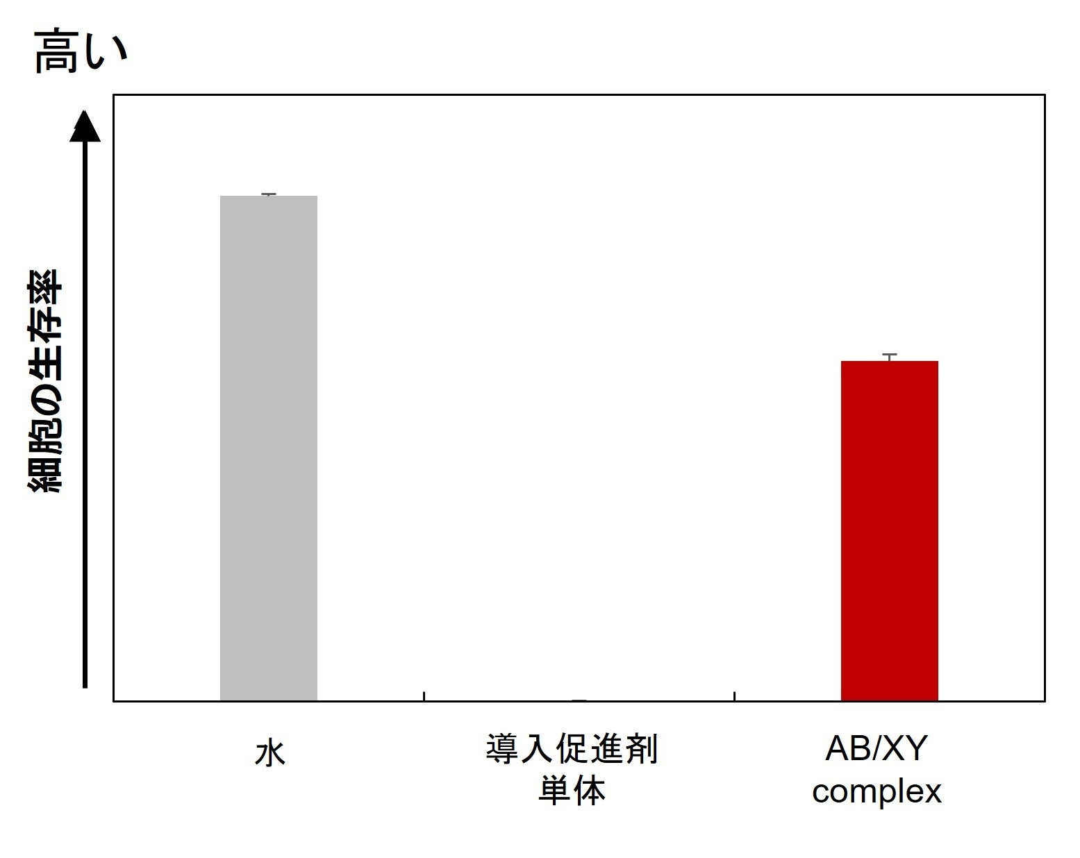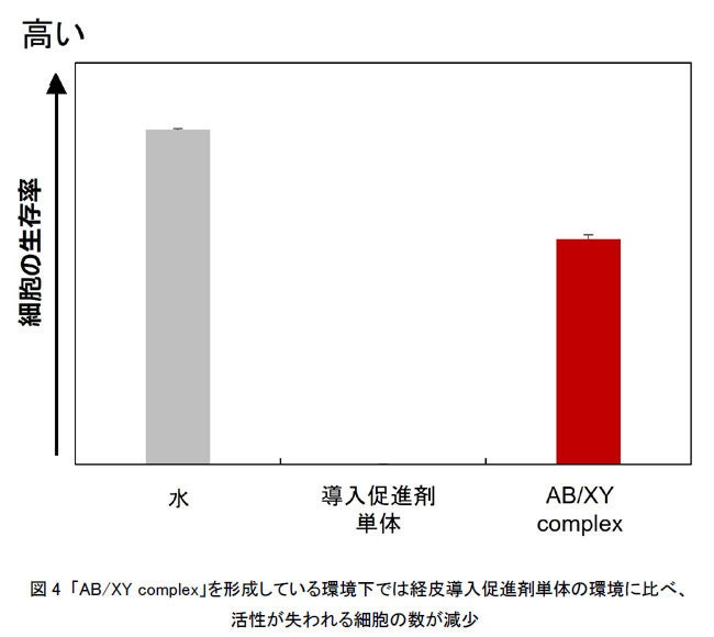 次に、薬剤の浸透促進効果を高めるだけでなく、皮膚の安全性向上の両立を検討しました。一般的に皮膚の細胞にダメージを与えると考えられている物質の構造の一部を、キシリトールが覆うことにより、細胞へのダメージが緩和されることから、今回開発したキシリトールを組み合わせている新規導入促進成分AB/XY complexを、生きている皮膚の細胞に暴露して細胞の生存率を観察しました。導入促進剤単独では細胞の生存が難しい実験条件における検証であったにも関わらず、新規導入促進成分AB/XY complexコンプレックスを細胞に暴露しても、ミトコンドリアの活性が失われる細胞の数は水への暴露同様、大きな減少は認められませんでした(図4)。