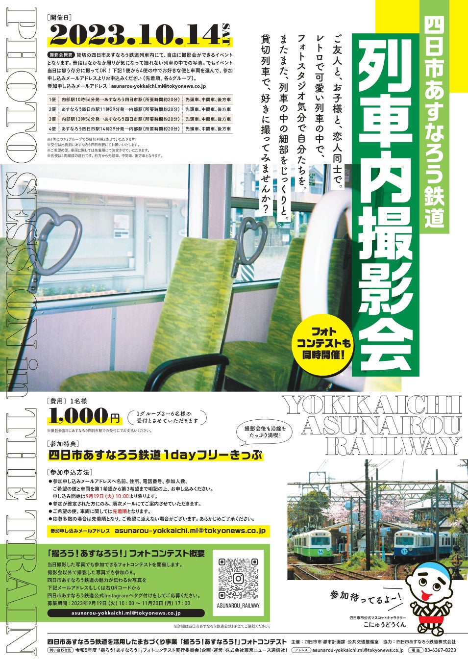 ・参加申し込みメールアドレスへ名前、住所、電話番号、参加人数、ご希望の便と車両を第1希望から第3希望まで明記の上、お申し込みください。申し込み開始は9月19日(火)10:00より承ります。(参加申し込みメールアドレス:asunarou-yokkaichi.ml@tokyonews.co.jp)