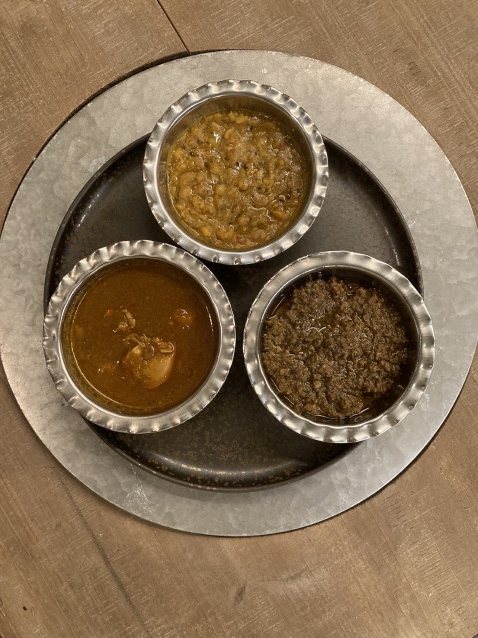 梅チキンカレー(画像:左下)とベンガルキーマ(画像:右下)、そしてダールタルカ(豆)(画像:上)の3種をご用意しました。それぞれタイプの違うカレーですので色々な味わいをお楽しみいただけます。梅チキンはさっぱりしていて梅独特の酸味が食欲を掻き立てます。ベンガルキーマはコクがあり香り高い仕上がりに。ダールタルカは数種類の豆を贅沢に煮込んだリッチな豆カレーとなっています。唐辛子も効いていて辛さも感じられるカレーです。3種類ともそれぞれ個性豊かなので単品でお召し上がるのはもちろん、3種類を混ぜて味の変化を楽しんでいただくのもおすすめです。