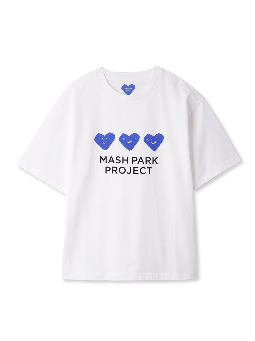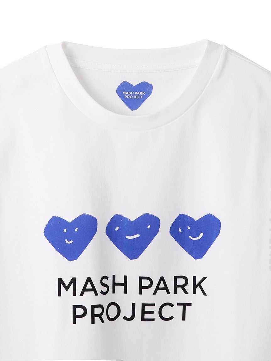 「MASH PARK PROJECT」のアイコンを胸元にデザインしたオリジナルTシャツは、レディースフリーサイズ、メンズM・Lサイズの3サイズ展開。“子どもたちに最高の笑顔を届ける”ことをコンセプトとする「MASH PARK PROJECT」を象徴するブルーのハートには、関わる人すべてに笑顔になっていただきたいという想いが込められています。ルームウェアとしてだけでなく、ボトムスやジャケットとのコーディネート次第で普段着にも取り入れていただけるアイテムです。