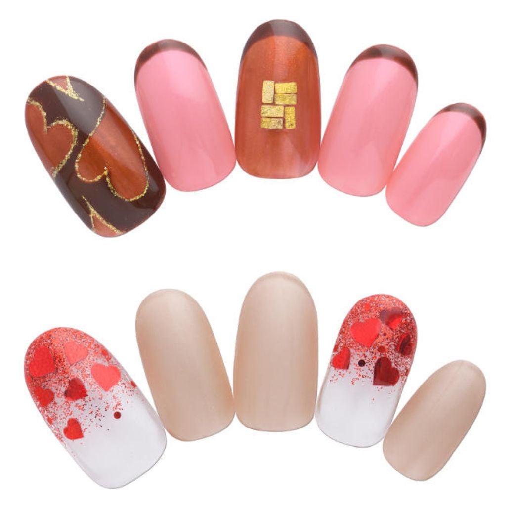 ハートのデザインで仕上げた、バレンタイン気分をさりげなく楽しめる大人可愛いネイルです。