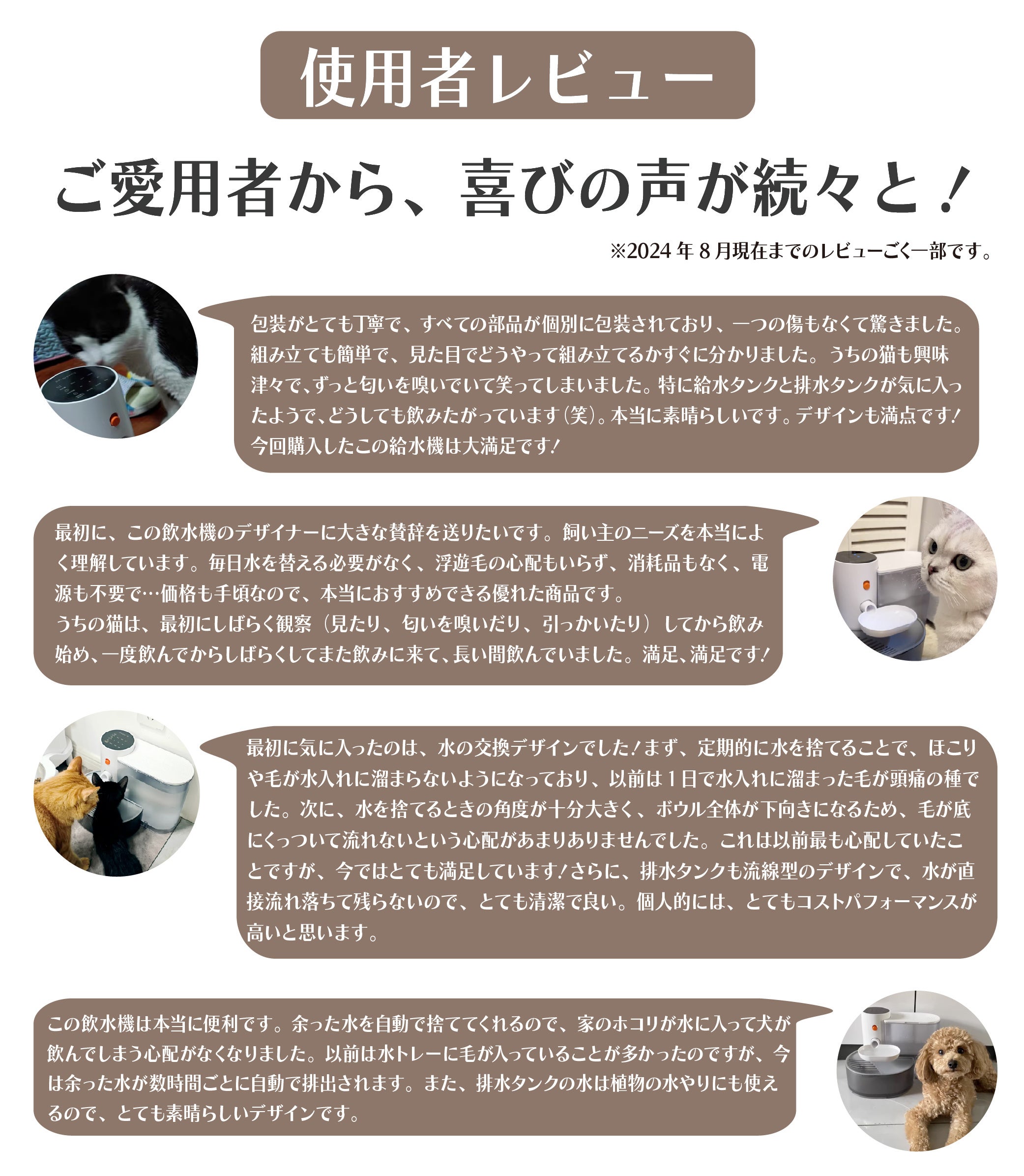定期的に受け皿の水を交換してくれるので衛生的で、飲み残しの水からの細菌繁殖を防ぎます。