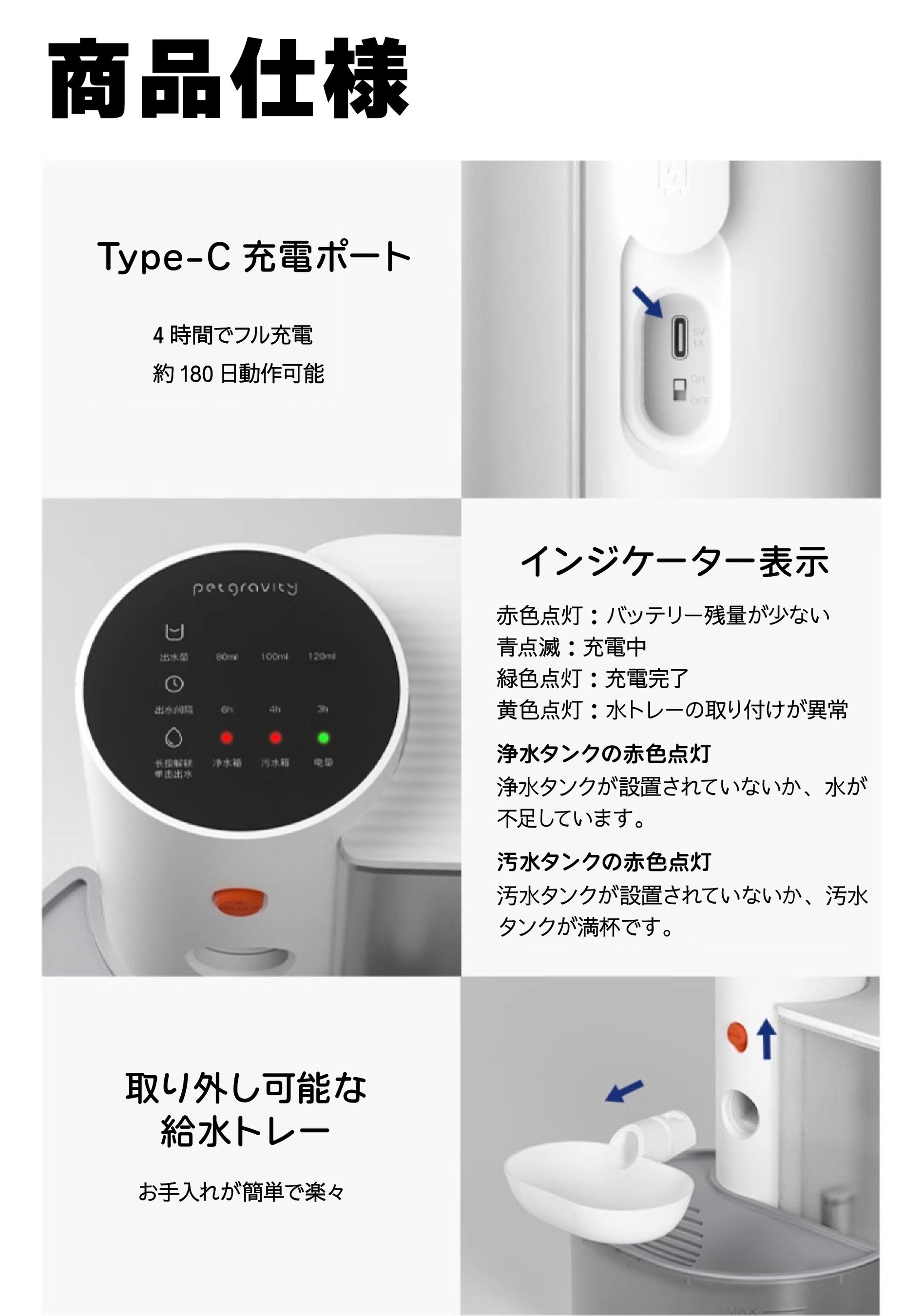 パッケージ内容 | ホストx1 浄水タンクx1 水トレーx1 汚水タンクx1 充電ケーブルx1 |