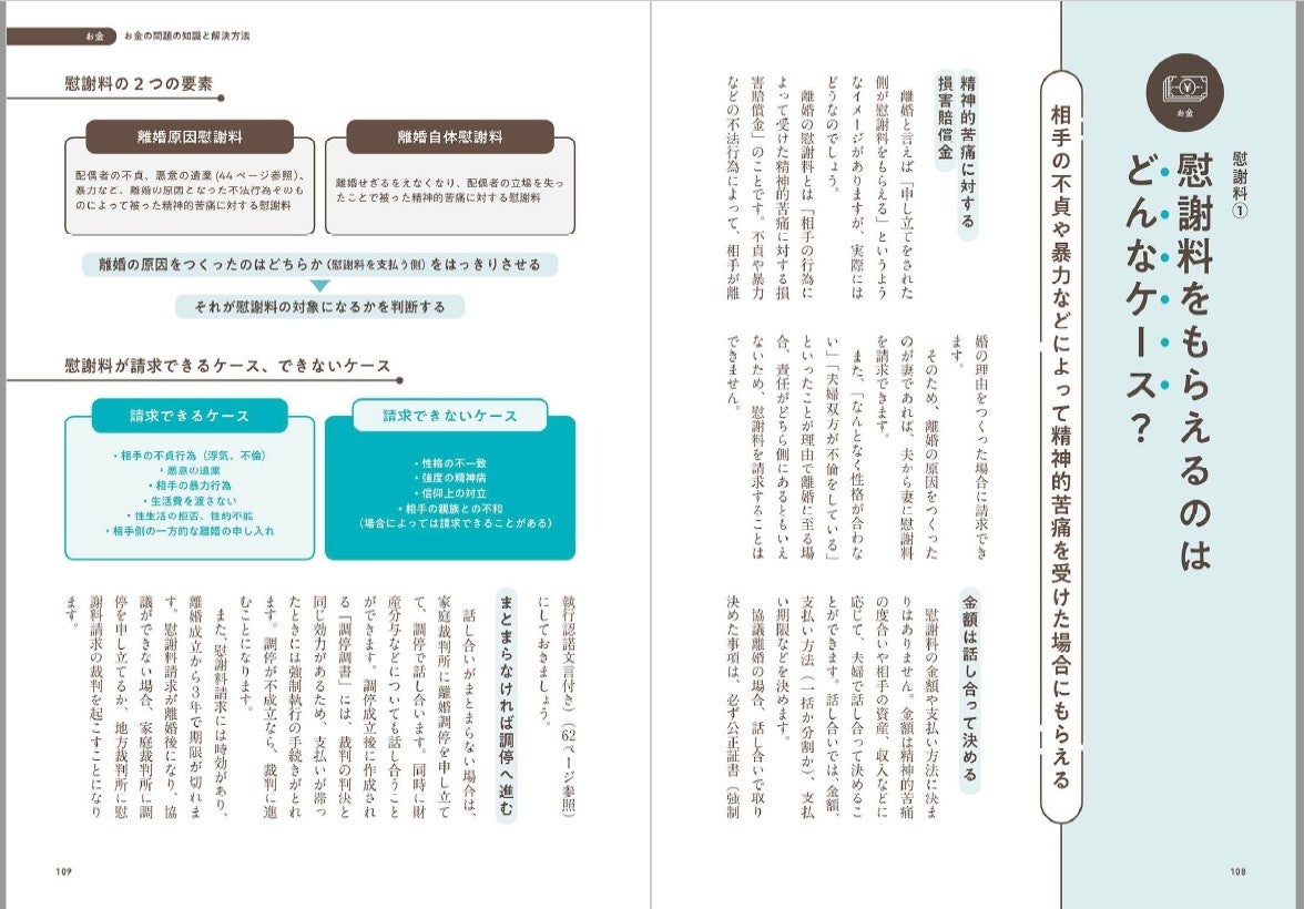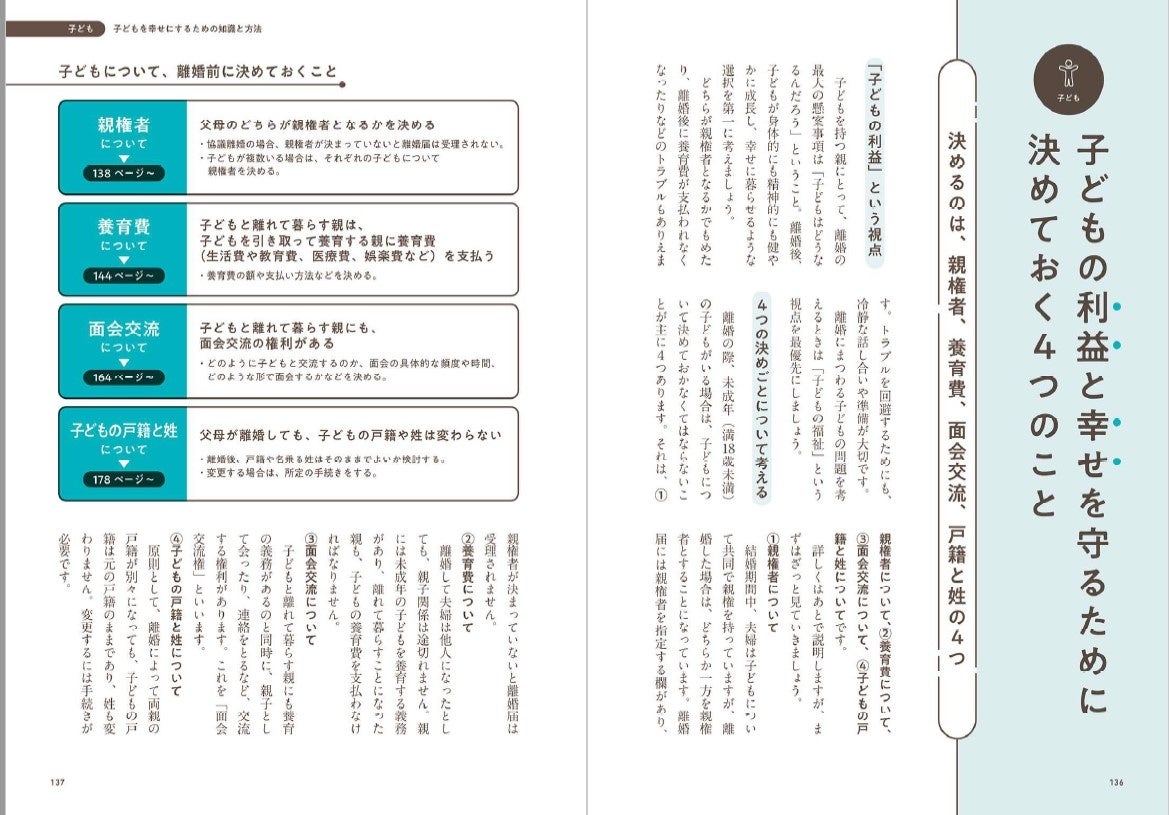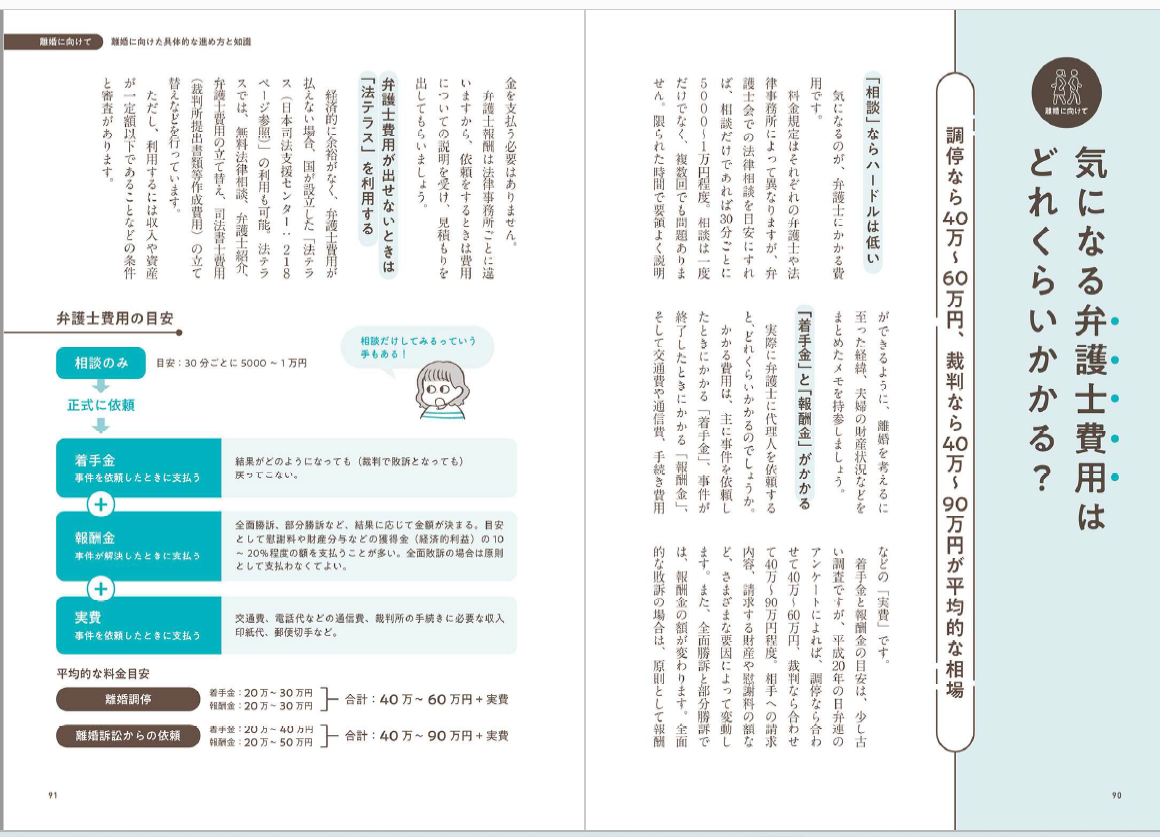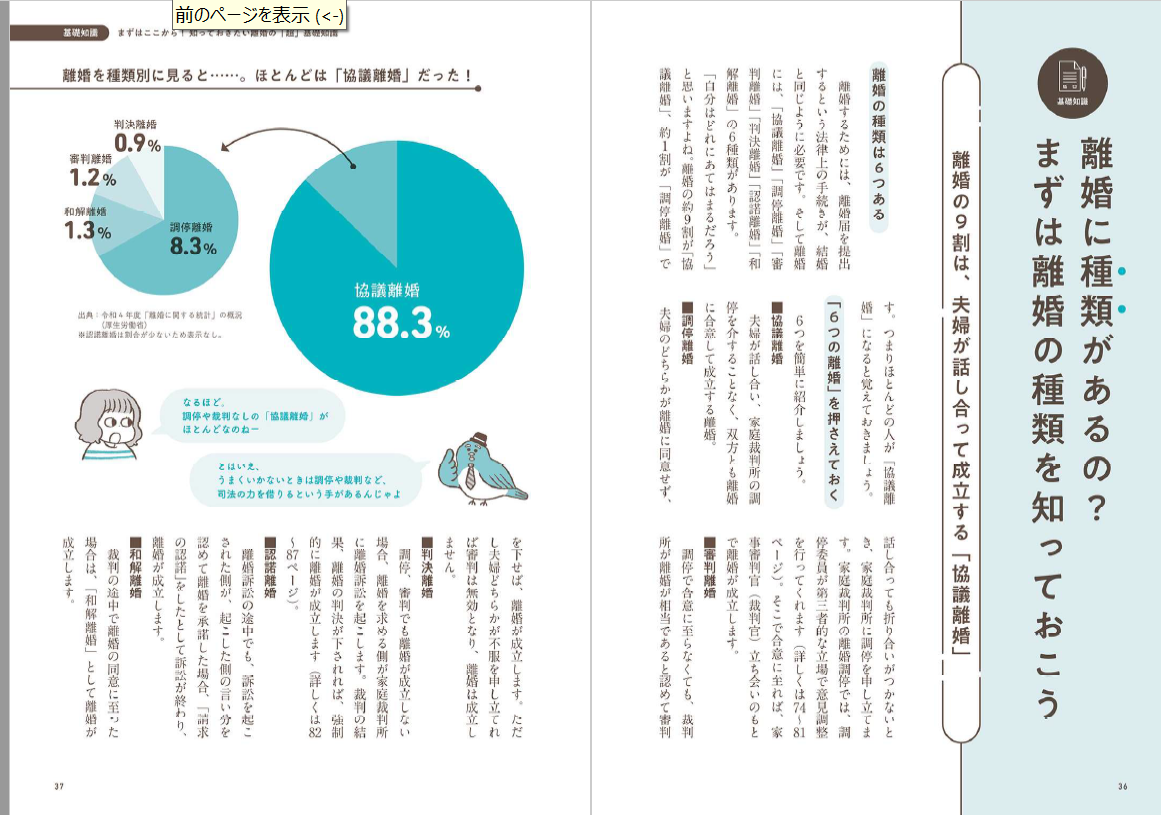 ではそんな離婚の基礎知識を紹介しています。そこからさまざまなプロセス、お金や権利など想定できる知識と手続きを、下記の章でわかりやすく解説しています。