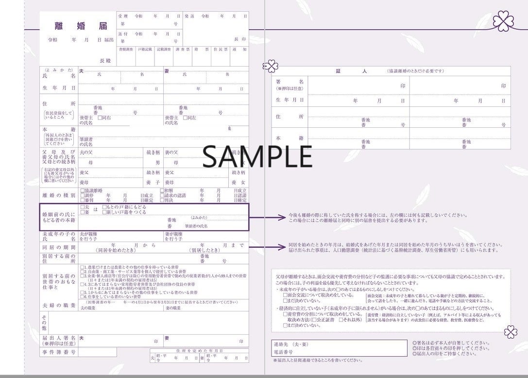 「離婚は<離れる力>で新しい幸せをつかむこと」として、「離」のエネルギーを生かす紫色に、軽やかに飛び立つ力をくれる鳥の翼と、幸運をもたらす四つ葉のクローバーの模様をあしらいました。これは法務省の要件を満たしたもので、実際に役所に提出できます。