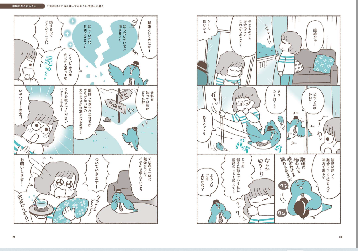 本書は、大原法律事務所のベテラン弁護士である服部弘先生に監修をいただき、離婚の超基本から、お金、子ども、権利、手続き方法など離婚にまつわる知識をわかりやすく解説しています。各章の巻頭にはマンガが掲載されているので、離婚へと進む主人公に共感しつつ読み進められます。