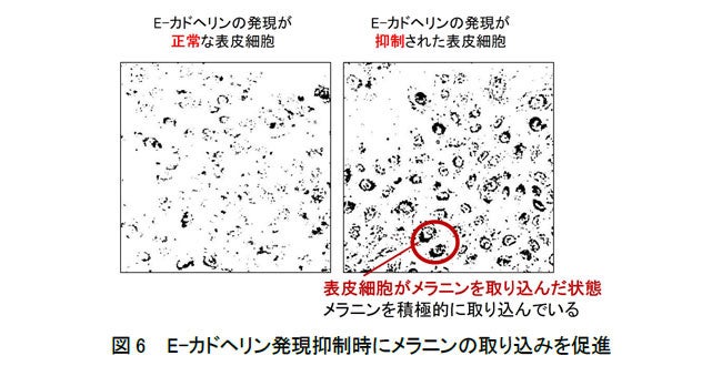 E-カドヘリンが減少している表皮細胞の下で、メラノサイトの動きを3次元かつリアルタイムに解析すること(4D動的解析)に成功し、この環境下において、メラノサイトそのものの動きが停滞することを発見しました。また、E-カドヘリンの発現が抑制された表皮細胞にメラニン添加すると、その取り込み活性が高くなっていることも分かりました(図6)。つまり、E-カドヘリンが減少し、メラノサイトが動かず局所的にメラニンが放出され、さらには表皮細胞が積極的にメラニンを取り込むことが、シミの発生・定着を引き起こす一因となっていると考えられます。