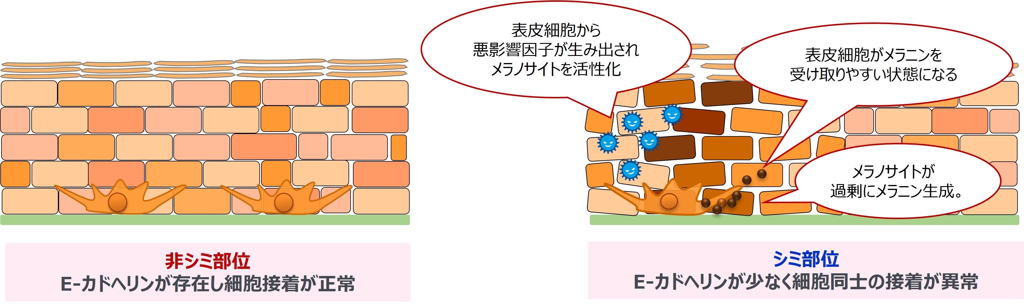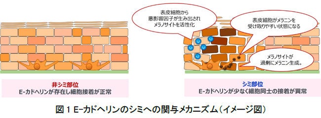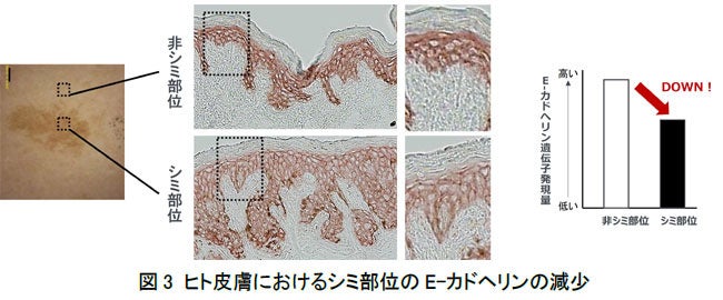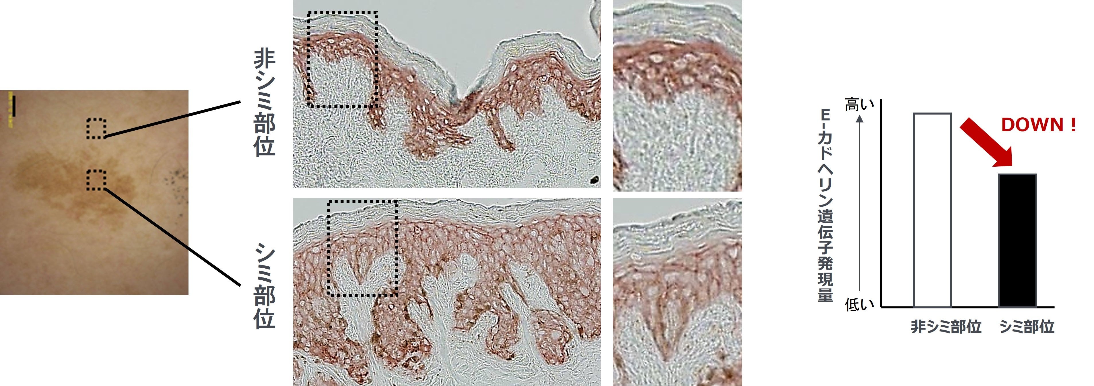 《ヒトのシミ部位皮膚におけるE-カドヘリンの減少とその減少によるシミ発生因子の増加》
