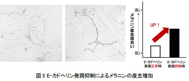今回、シミの根本的な原因を探るべく、メラノサイトとその周辺環境を深掘りしました。先行研究において、メラノサイトが正常に機能するためには、適度な細胞接着の存在が必要であることが知られています。そこで、細胞接着において特に重要な分子であり、皮膚組織の恒常性維持にも重要なE-カドヘリンに着目し、シミとの関連性について研究を進めました。ヒトの皮膚を用いて、正常な部位とシミのある部位を比較したところ、シミのある部位ではE-カドヘリンが減少していることがわかりました(図3)。また、E-カドヘリンの発現が抑制された表皮細胞由来の分泌物質をメラノサイトに作用させると、メラニン生成に関わる因子であるチロシナーゼの発現が亢進しました(図4)。また、E-カドヘリンの発現が抑制された表皮細胞下では、メラノサイトにおけるメラニンの産生が増加しました(図5)。つまり、表皮細胞のE-カドヘリンの減少によって表皮細胞同士の接着が弱まり、シミ因子の分泌が増加し、メラノサイトが活性化されてメラニン産生が亢進することが明らかとなりました。