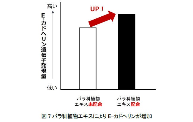 ヒトの表皮細胞を用いた実験で、バラ科植物由来のエキスにE-カドヘリンの発現を促進する効果があることを見出しました (図7)。減少したE-カドヘリンを正常化することで、シミの発生・定着の予防および根本的な改善へのアプローチが期待されます。