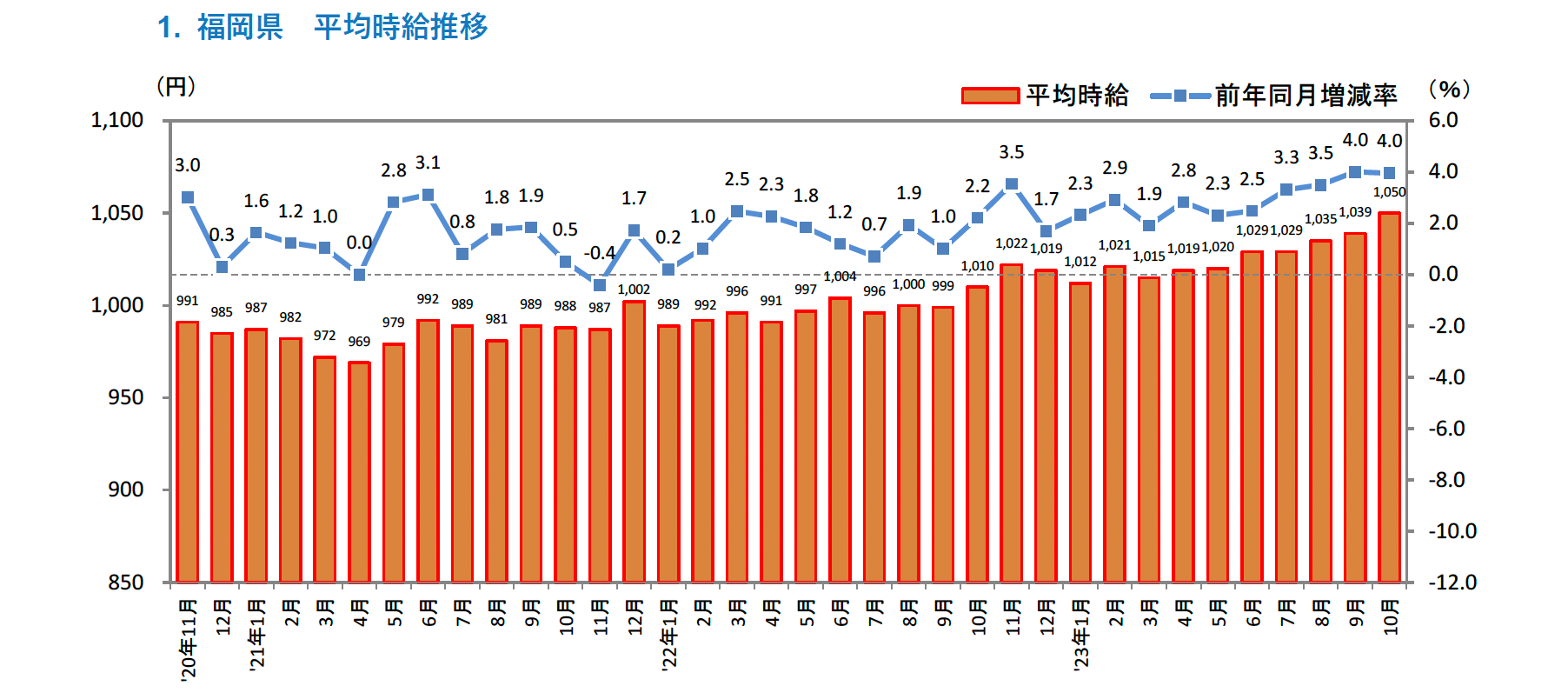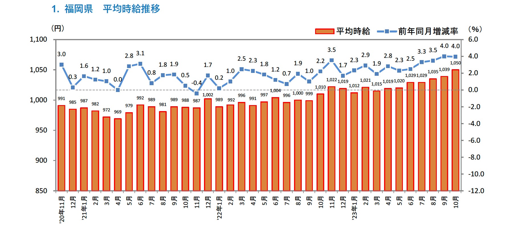 ■福岡県の平均時給は1,050円(前年同月1,010円、前月1,039円)