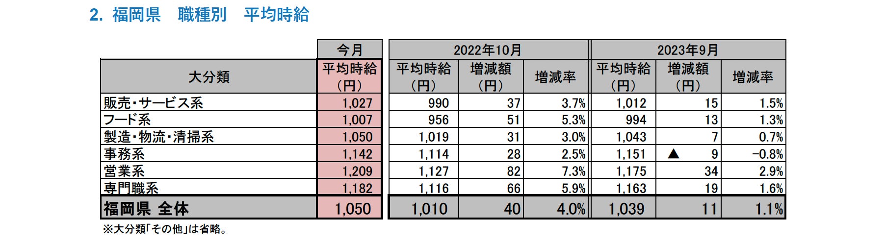 [福岡県版]2023年10月度 アルバイト・パート募集時平均時給調査 福岡県の10月度平均時給は前年同月より40円増加の1,050円