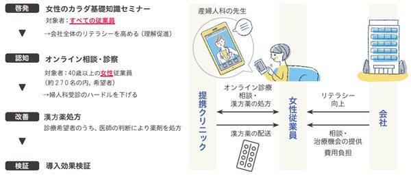 ・40歳以上の女性従業員のうち、希望者にオンラインでの婦人科診療および更年期症状に関する相談や、漢方薬などの処方・配送を行い、健康状態とQOL(クオリティ・オブ・ライフ)の向上を図ります。