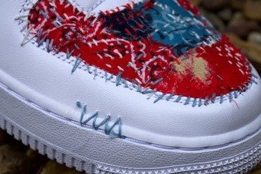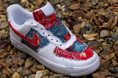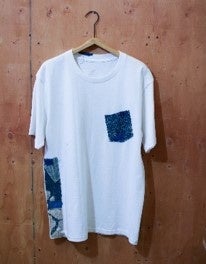 スポーツアイテムであるTシャツ、スニーカーに端切れ布を手縫いで刺していきます。
