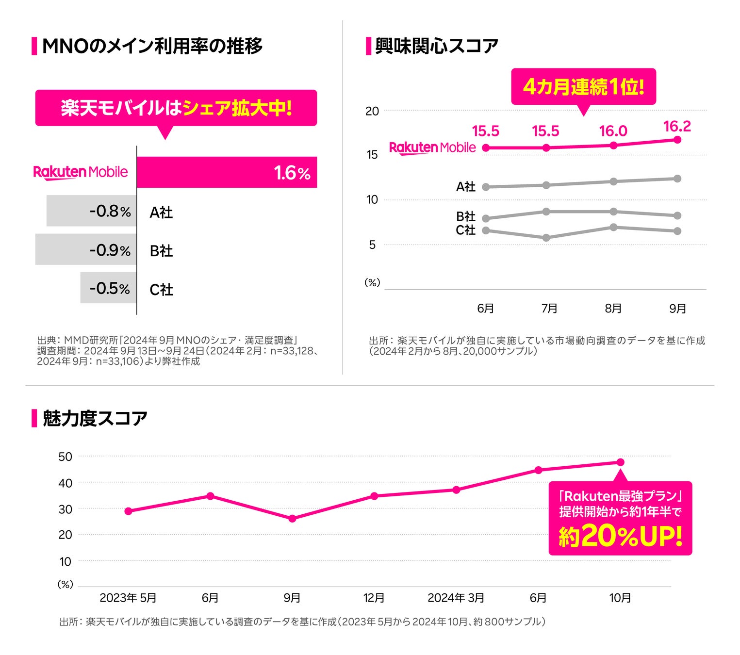 楽天モバイル株式会社(以下「楽天モバイル」)は、2024年10月18日(金)を以て、契約数が800万回線を突破したことをお知らせいたします(注1)。サービス本格提供開始から約4年半で達成しました。また、第三者機関が実施した最新調査において、楽天モバイルのMNOメイン回線利用が他キャリアと比較し最も増えていると発表されました(注2)。