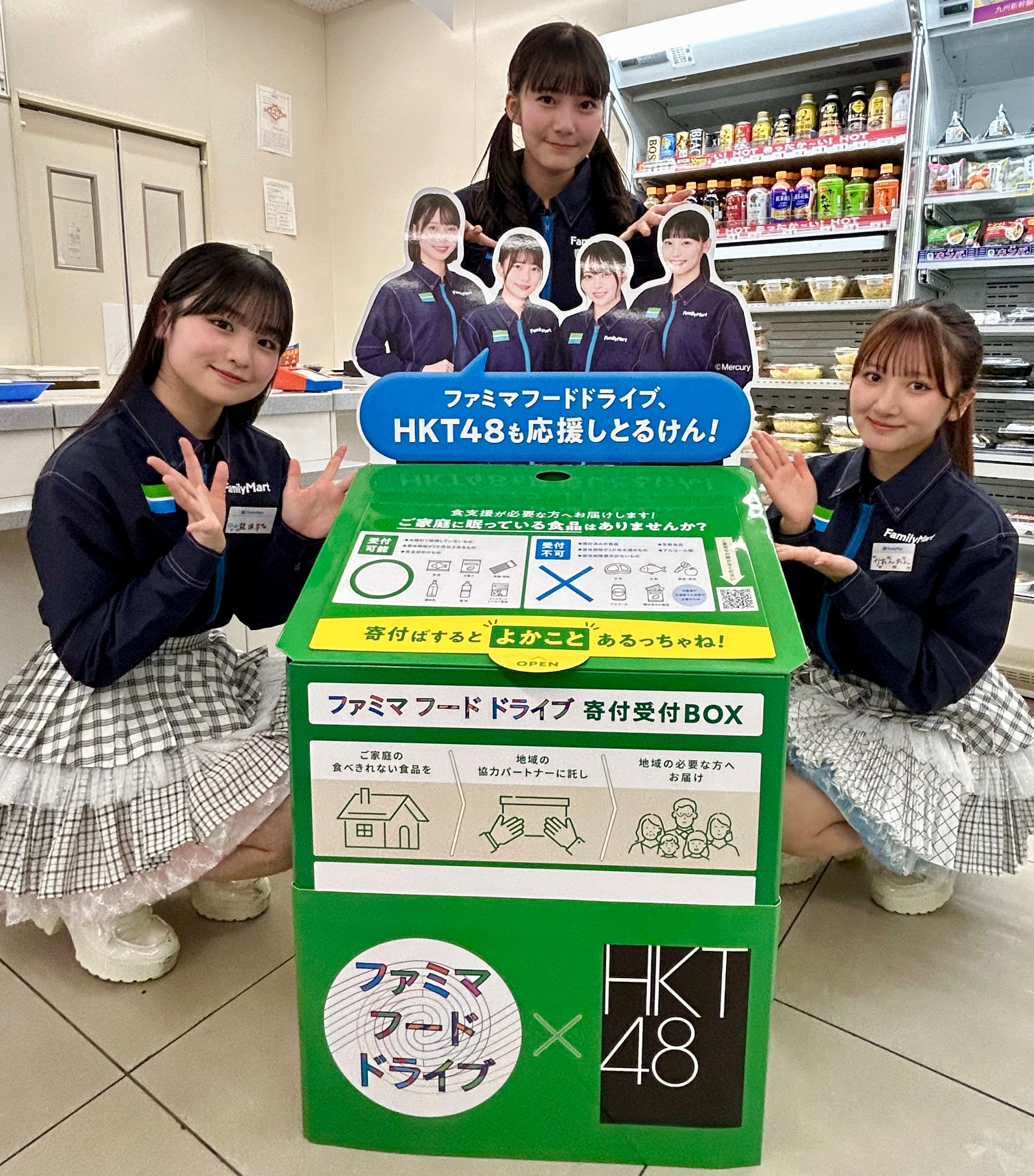このたび「いちばん地域に愛される」を目指した取り組みの一環として、2025年より継続している株式会社Mercury(マーキュリー)(本社:福岡県福岡市中央区、代表取締役:尾藤 洋介)が運営する「HKT48」との取り組みである、「ファミリーマート×HKT48 地域密着・九州応援プロジェクト」の新たな企画として、特別仕様の「ファミマフードドライブ」寄付受付BOXの展開を2026年4月22日(水)より順次展開いたします。