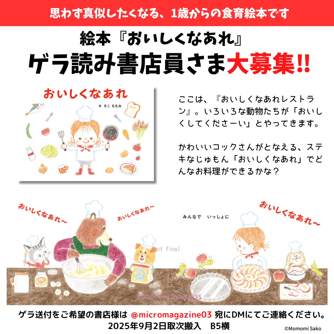 マイクロマガジン社(東京都中央区)は、2025年9月刊行予定の新作絵本『おいしくなあれ』のゲラ(校了前の原稿)を読んでくださる書店員さまを募集いたします。