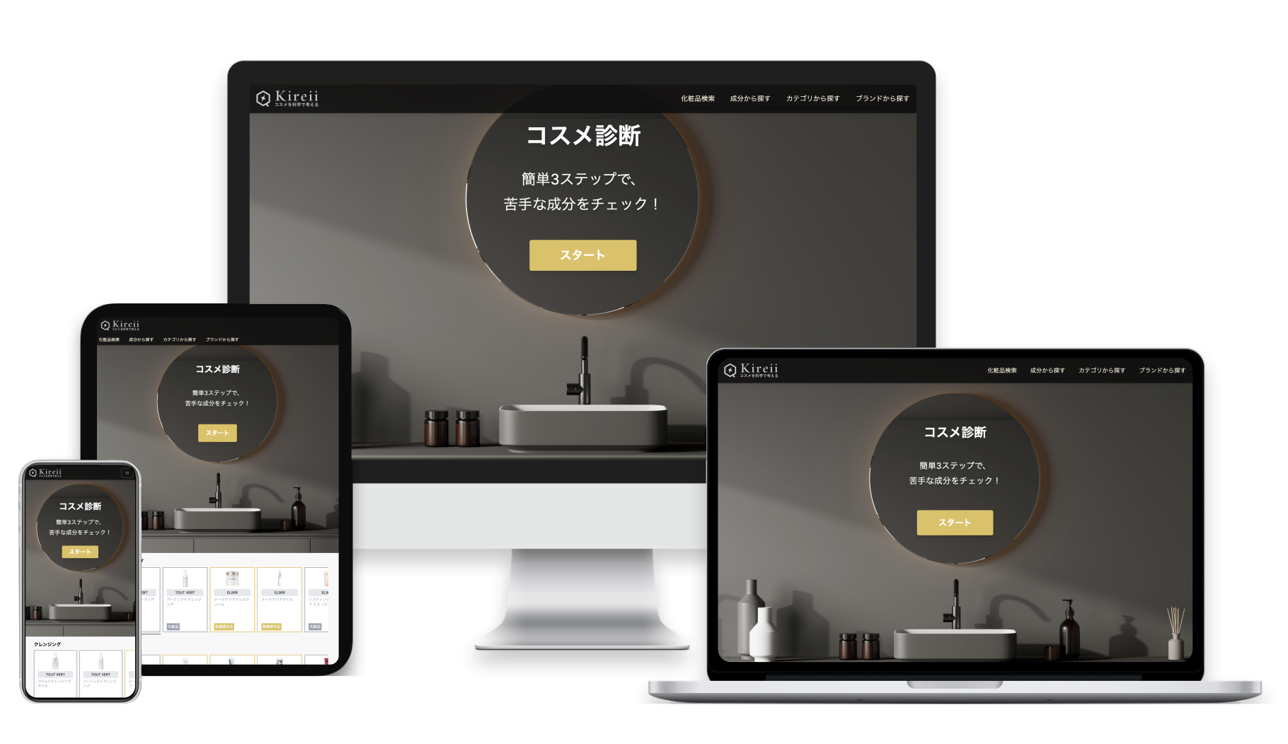 Kireiiは、化粧品類(※)を「成分」で検索できるWebサービスです。好きな成分で絞り込み、さらに、苦手な成分は除外することにより、自分に最適な化粧品類を見つけられます。また、好きな化粧品類と成分が似ている化粧品類を探すことも可能です。DHGSでは、このサービスの需要は飛躍的に拡大すると考えています。
