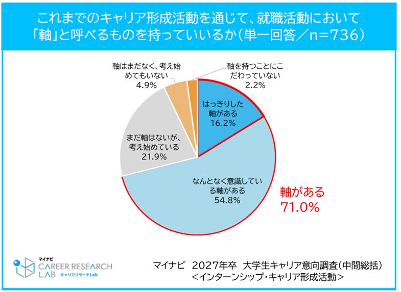 2027年卒の学生のキャリア形成活動参加率は87.1%。キャリア形成活動を通じた、就職活動における「軸」がある学生は71.0%