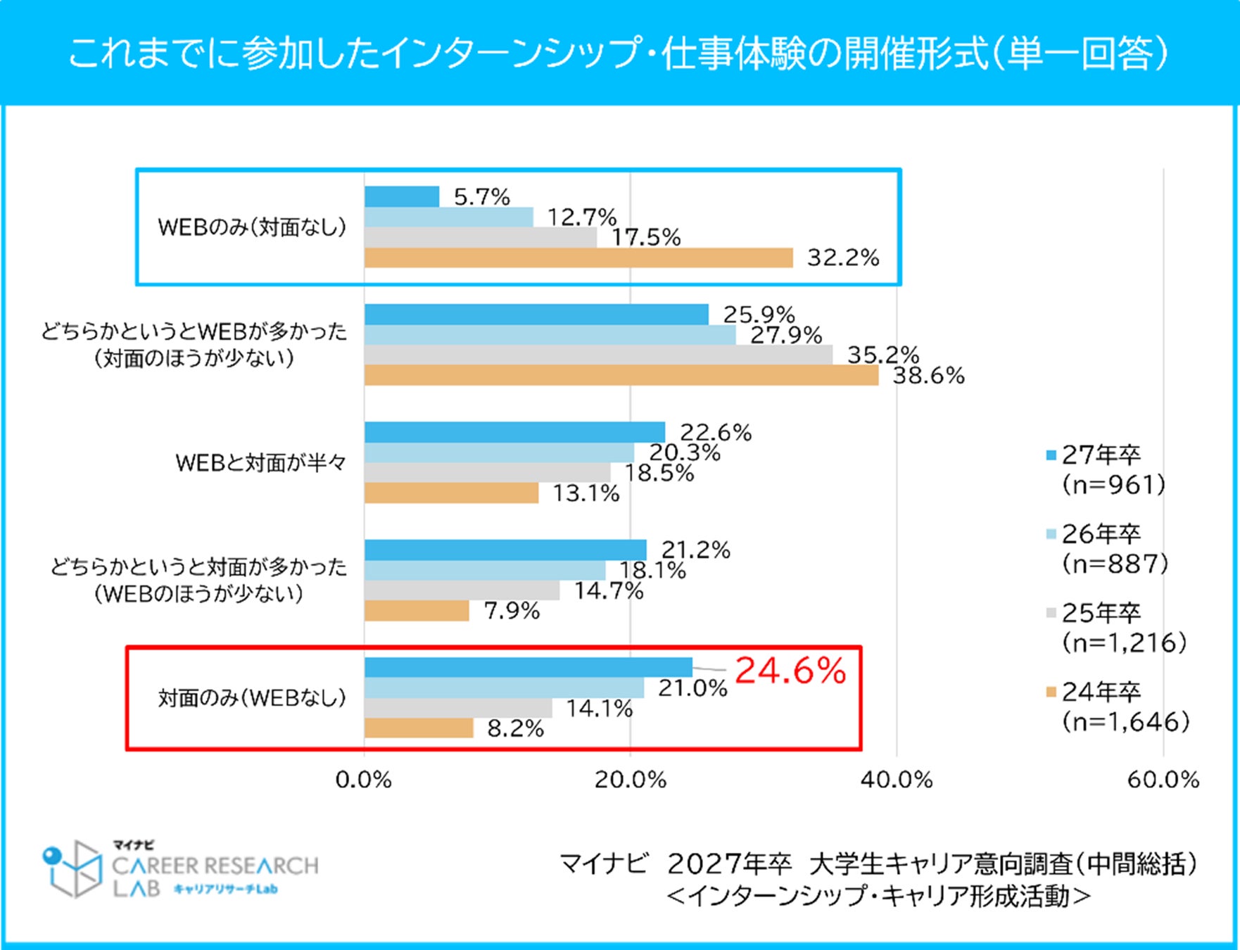 ◆インターンシップ・仕事体験において「対面のみ」のプログラムに参加する割合が前年比3.6pt増「WEBのみ」は24年卒より26.5pt低下
