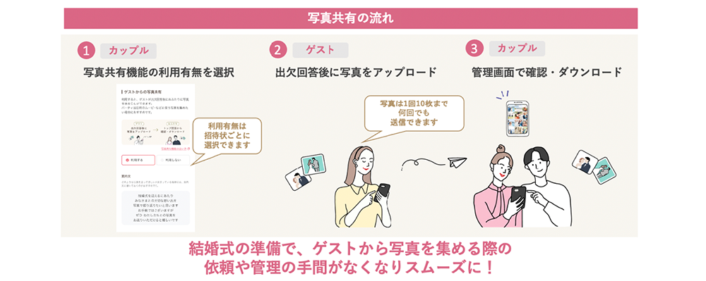今回の追加機能である「写真共有機能」は、式の出欠回答のタイミングで、カップルからゲストに対して写真の提供を依頼し、収集ができるサービスです。従来は、ゲストに個別に連絡を取り、思い出の写真を集めたり、当日会場でゲストの顔写真を撮影したりしていましたが、本機能によって事前にスムーズに写真の収集が可能となります。結婚イベントを便利にするだけでなく、イベント自体の体験価値をより上げていくことを目指し、参加者全員が幸せな時間を過ごすことができるように引き続きサポートしてまいります。」
