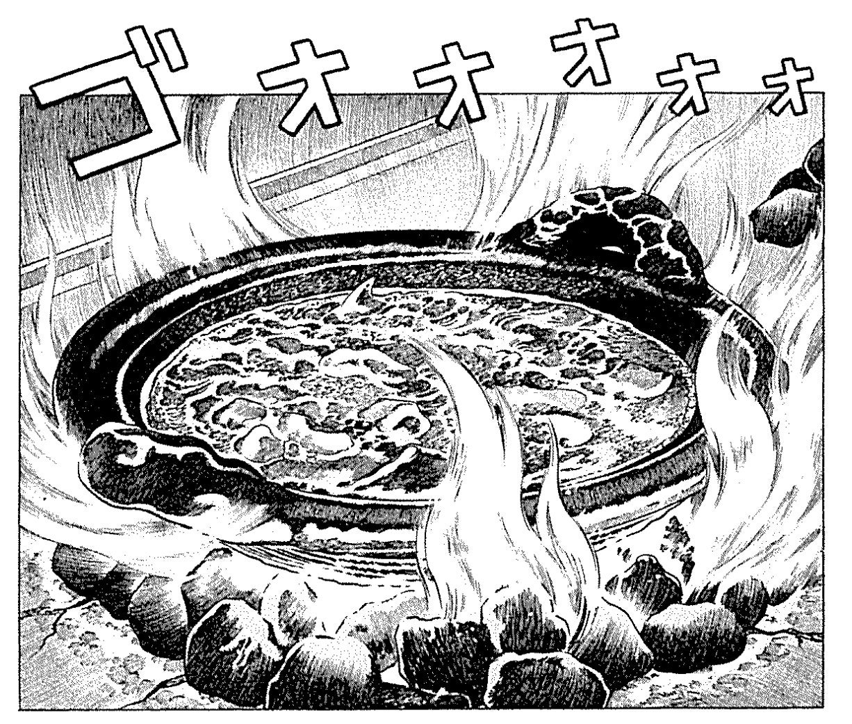 今にも大きな音が聞こえてきそうな画力。1600℃以上にもなる高火力ですっぽんを一気に炊く、『大市』(上京区)の「まる鍋」。