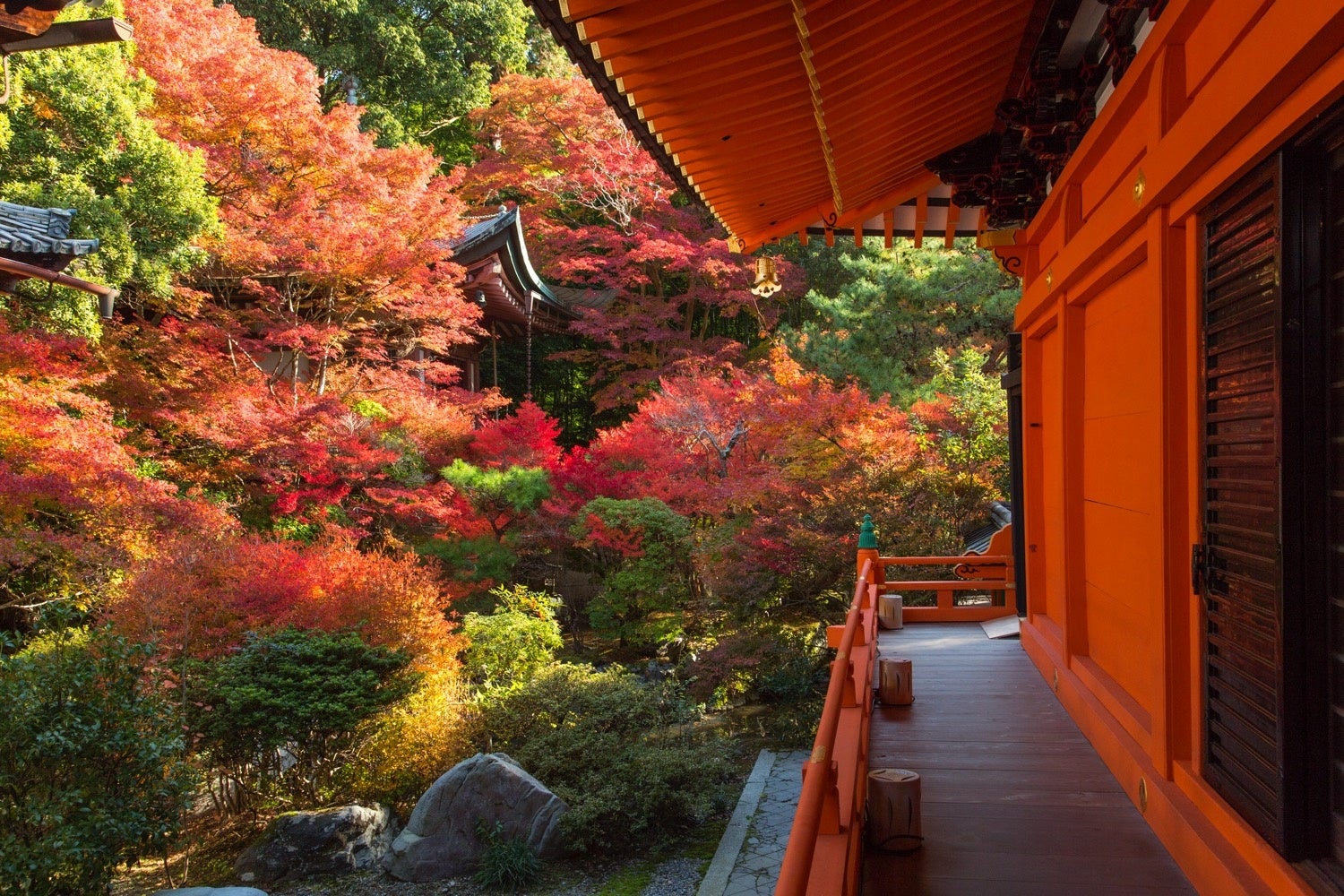 山科の古刹・毘沙門堂門跡の本堂から庭園を望む。11月中旬には紅葉が盛りとなる。
