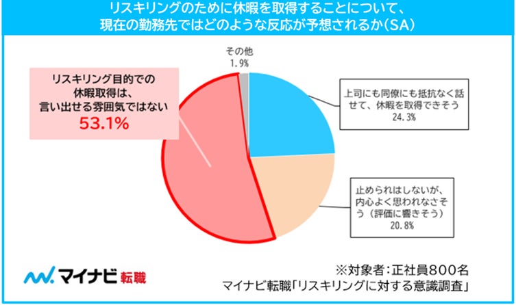 一方、「リスキリングのために休暇を取得することについて、現在の勤務先でどのような反応が予想されるか」では、「会社に言い出せる雰囲気ではない(53.1%)」が半数を超え、「内心よく思われなさそう(20.8%)」と合わせると7割以上が、現在の職場ではリスキリングのために休暇を取得することは難しいと感じていることがわかった。【図4、5】
