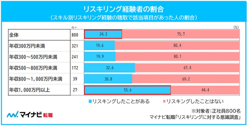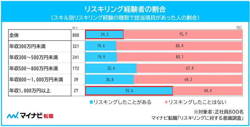 ◆正社員のうち約4人に1人がリスキリングをしたことがある。年収1,000万円以上の2人に1人がリスキリング経験者、1,000万円未満では3割にとどまる【図1】
