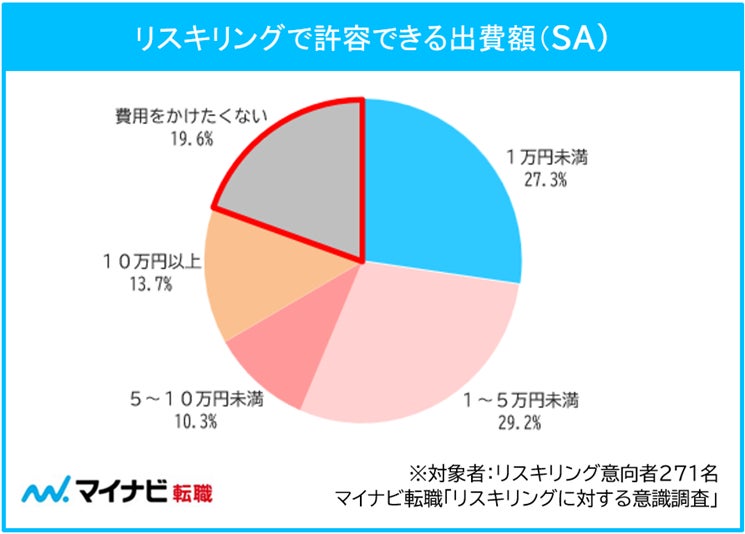 リスキリングにおける負担金額の許容額については、5万円未満(「1万円未満(27.3%)」+「1~5万円未満(29.2%)」)が約半数だった。
