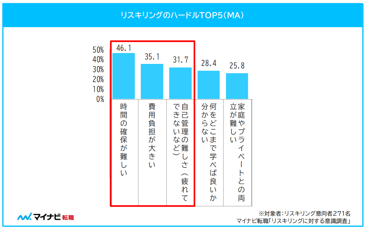 リスキリング意向がある人に、リスキリングのハードルになるものは何かを聞くと、「時間の確保が難しい(46.1%)」が最多で、「費用負担が大きい(35.1%)」、「自己管理の難しさ(28.4%)」と続いた。