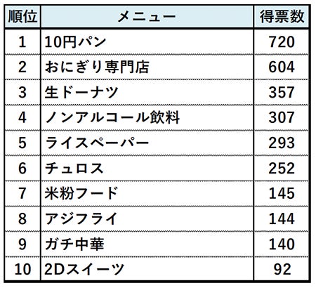 ※提示した選択肢:バクラヴァ、生ドーナツ、チュロス、カンノーリ(カンノーロとも)、豆ヌードル、10円パン、米線(ミーシェン)、ニューヨークロール(シュプリームクロワッサンとも)、シュヌレ、おにぎり専門店、ノンアルコール飲料、2Dスイーツ、クァベキ、プヂン、デーツ、ロゼ料理、胡椒餅、ライスペーパー、アジフライ、巨大ピザ、ガチ中華、米粉フード、その他