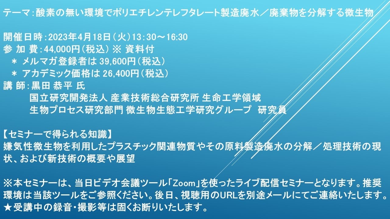 【ライブ配信セミナー】酸素の無い環境でポリエチレンテレフタレート製造廃水/廃棄物を分解する微生物 4月18日(火)開催 主催:(株)シーエムシー・リサーチ