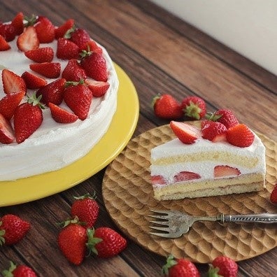 イチゴのショートケーキです!しっとりふんわり食感のスポンジ生地に、いちごと生クリームをサンドしました。