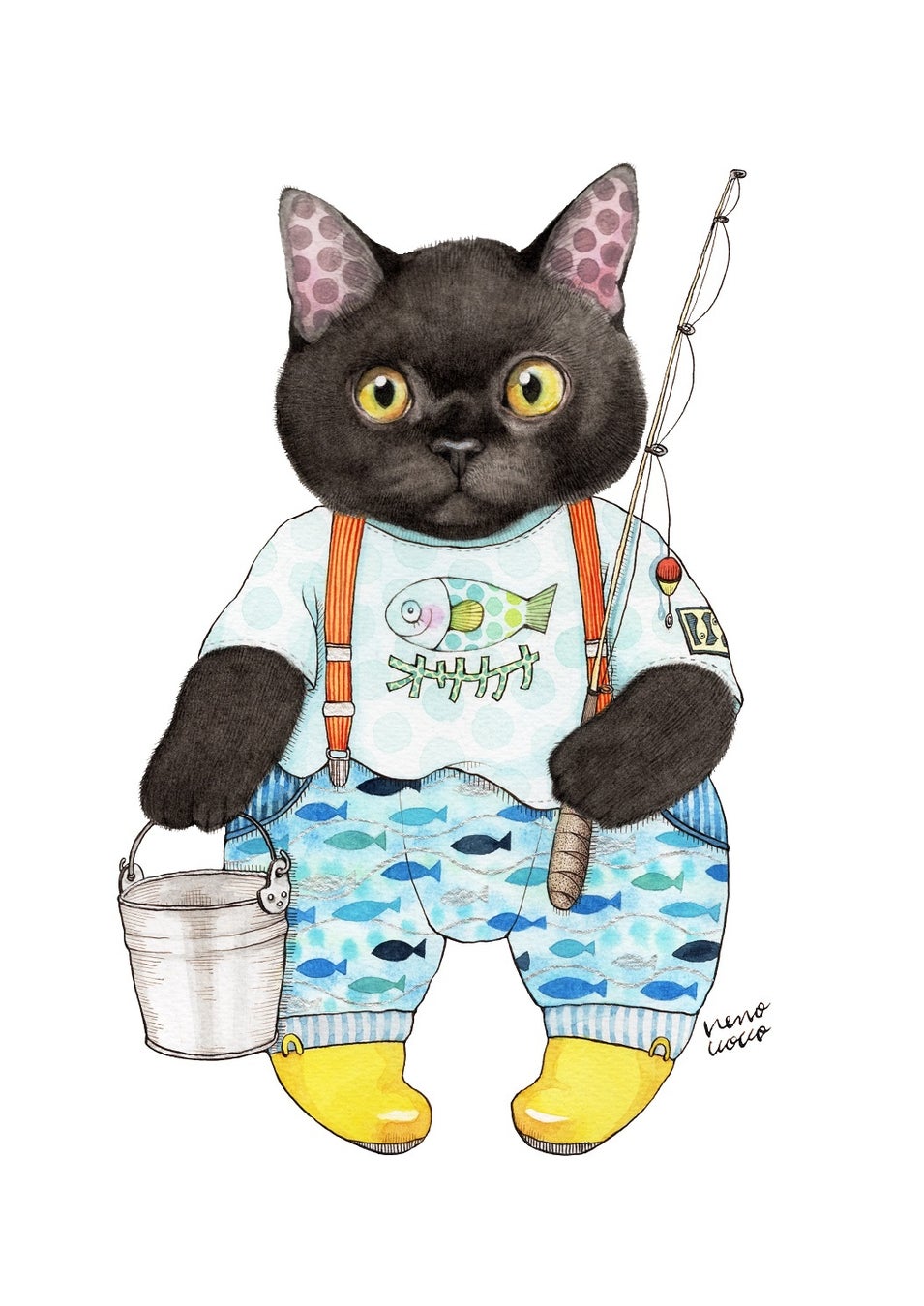 主に透明水彩絵の具を使って「猫の肖像画」のイラストを描いています。見ているだけで楽しくなるような絵柄でカラフルなお洋服を着ているのが特徴です。