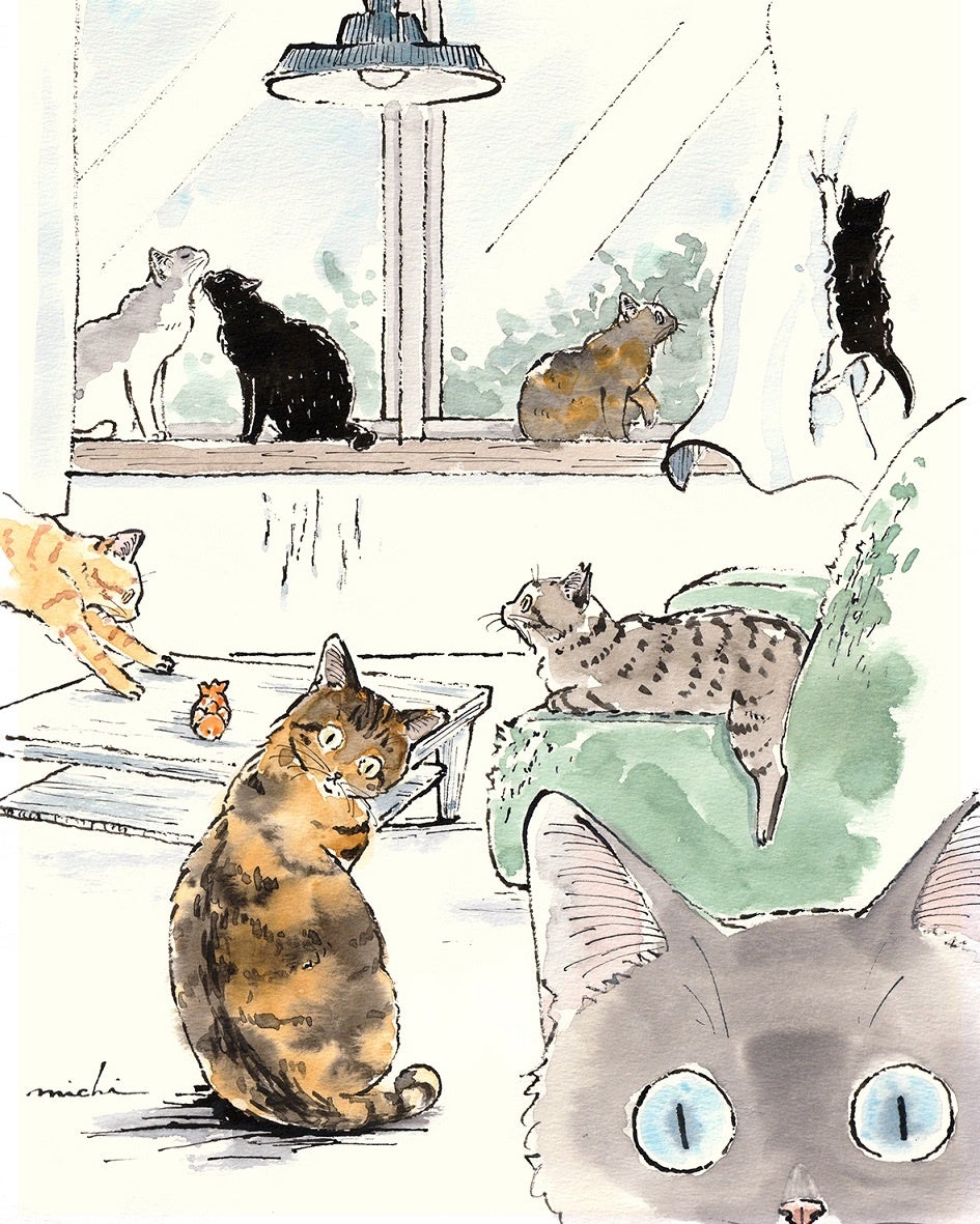 2017年「完全室内飼いのネコたちの暮らし」をテーマに、部屋でのんびり穏やかに過ごすネコたちの作品を初めての個展で発表しました。
