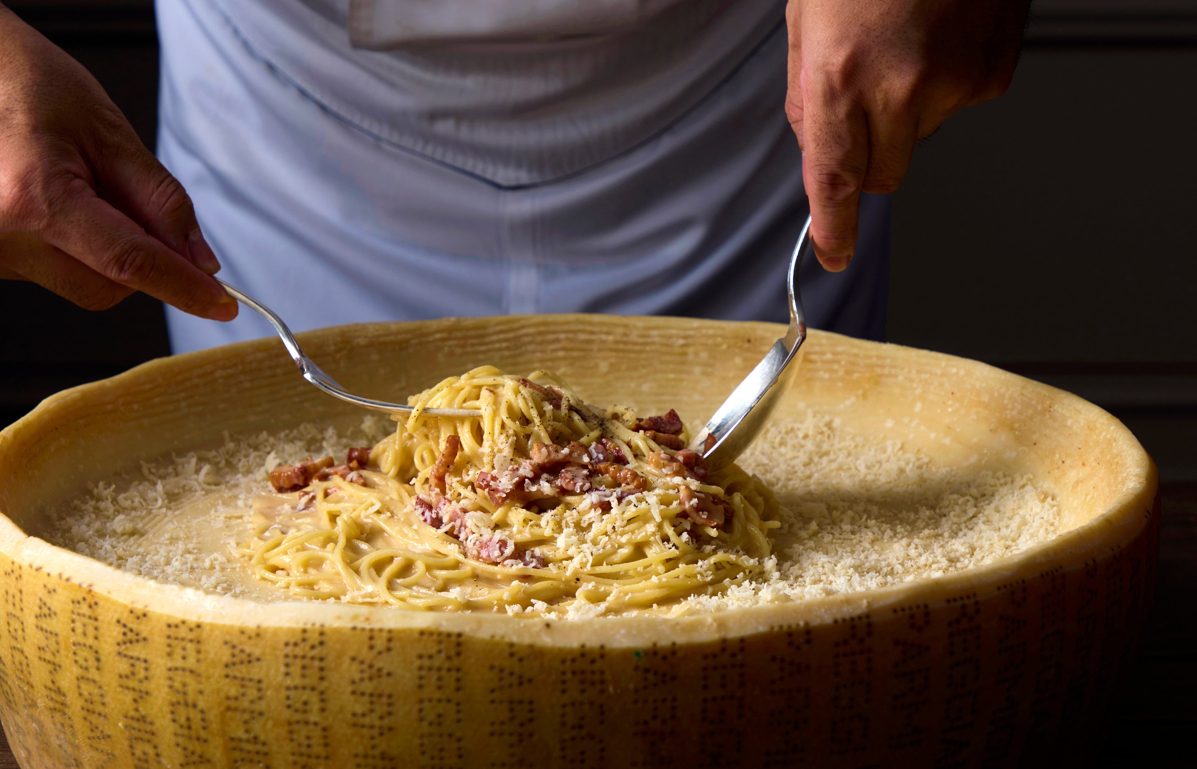 ・ホールチーズで仕上げるスパゲッティ・カルボナーラ