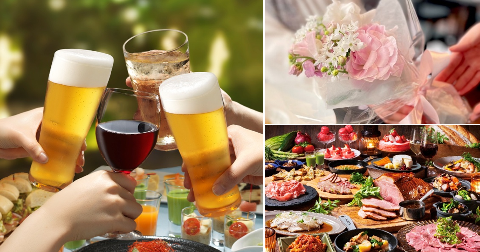 歓送迎会や同窓会、ご家族でのお祝い、職場の懇親会など、あらゆる集いが増える春。想いを込めた“花束”で、たいせつな方を囲む時間をより一層華やかに彩る「ミニブーケ付ディナービュッフェプラン」をご用意しました。飲み放題付きのビュッフェ形式で、食の好みを問わず、飲む人・飲まない人、それぞれのスタイルでお楽しみいただけます。