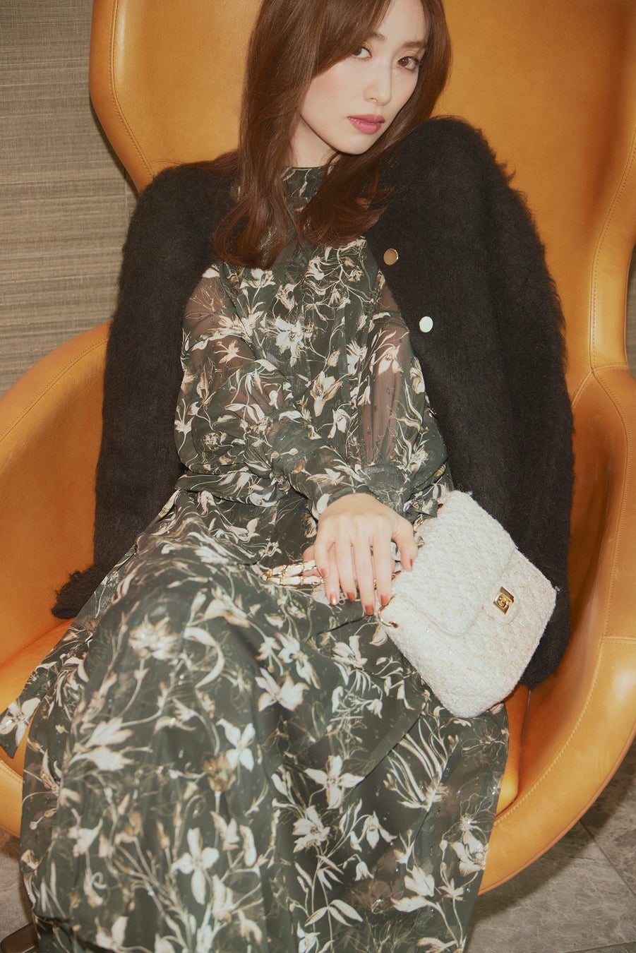 Knit cardigan ¥18,920 / Dress ¥31,900 / Pierced earrings ¥8,250 / Bag【Online Limited】 ¥13,640