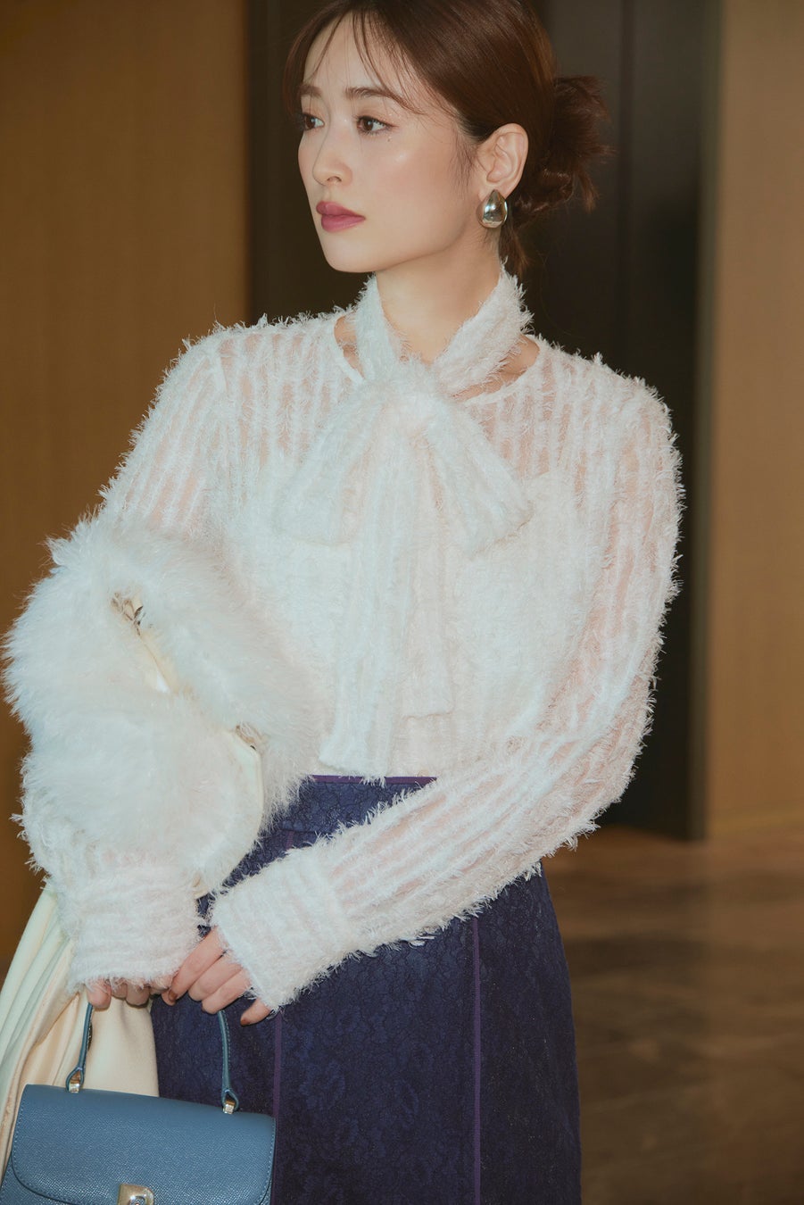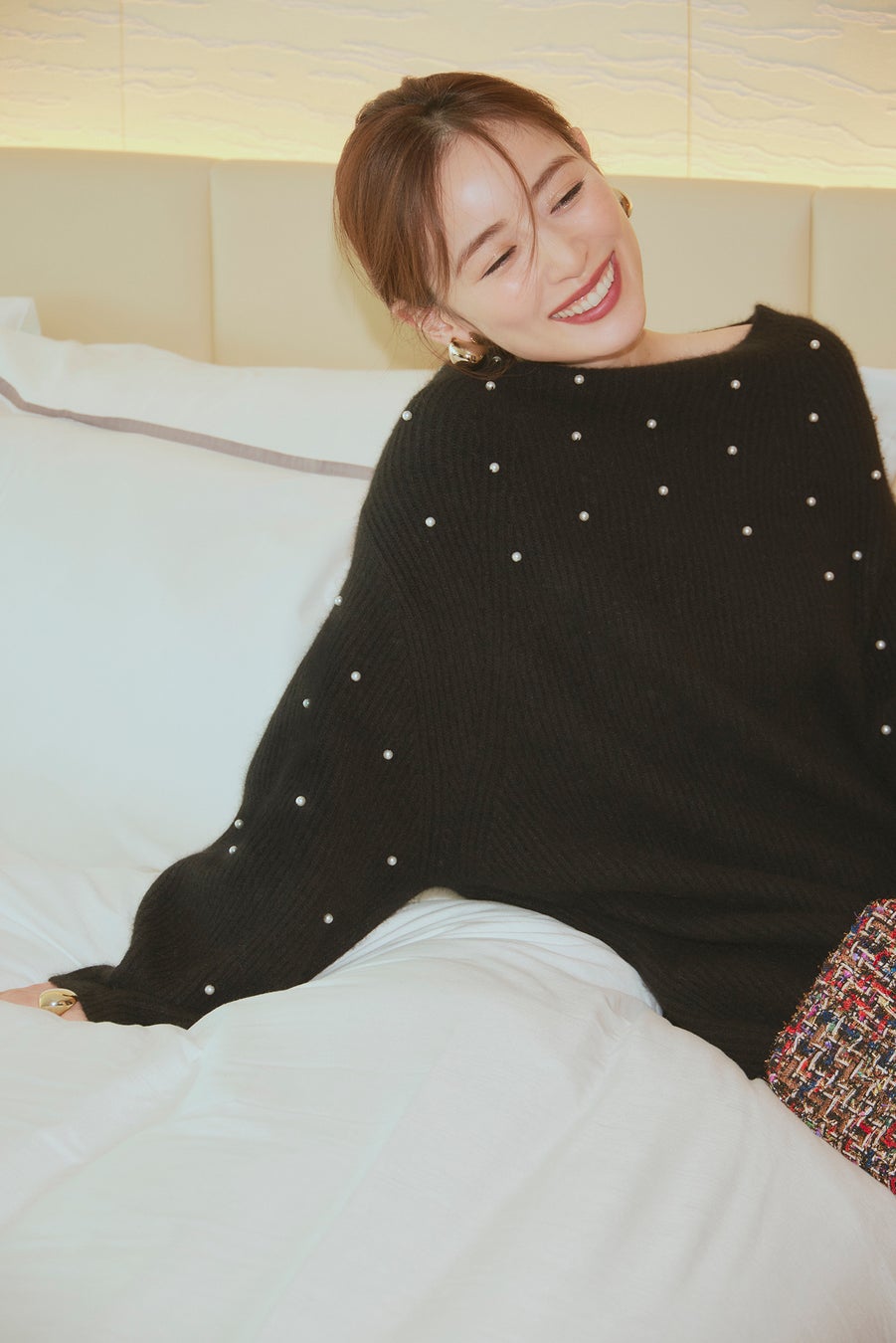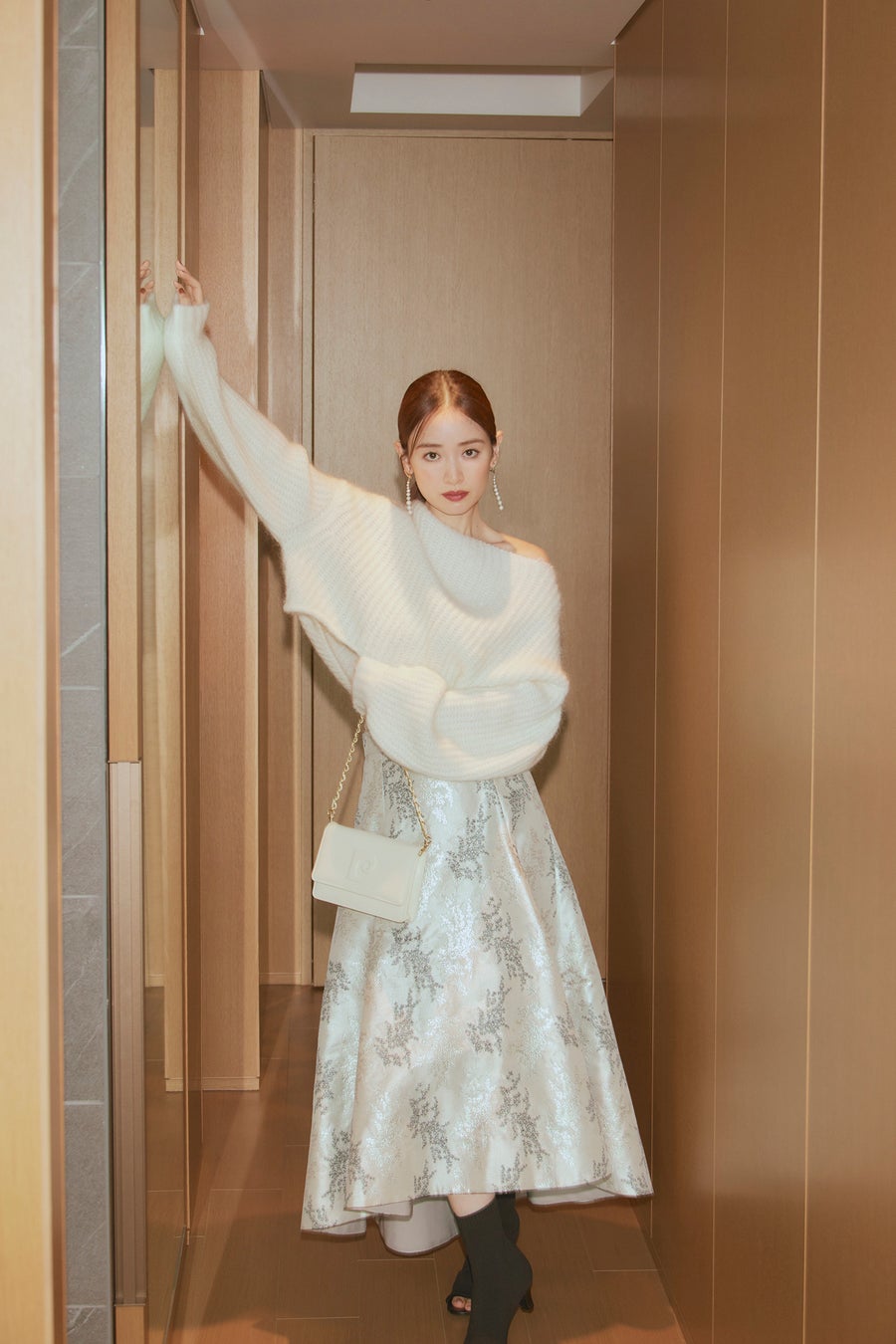Knit tops ¥16,500 / Skirt ¥39,600 / Pierced earrings ¥8,250 / Bag ¥36,300 / Shoes ¥19,800