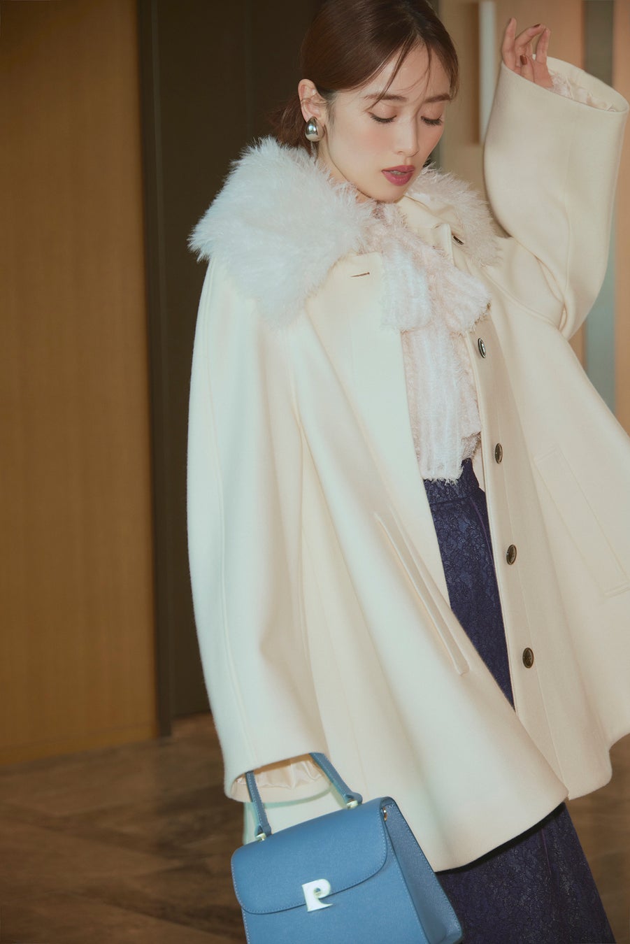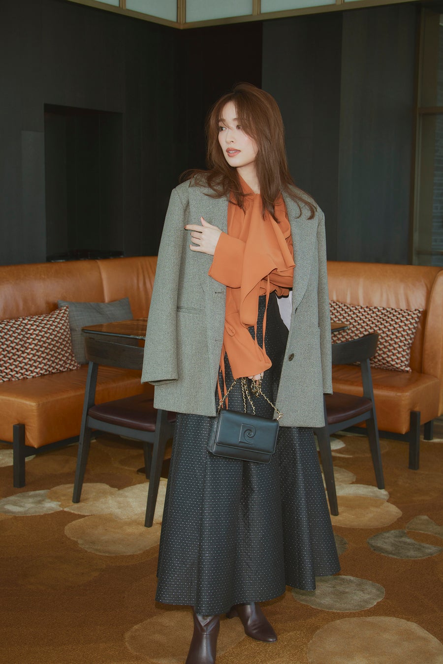 Coat ¥59,400 / Blouse ¥23,100 / Skirt ¥20,900 / Earrings ¥10,340 / Bag ¥39,600 / Shoes ¥24,200