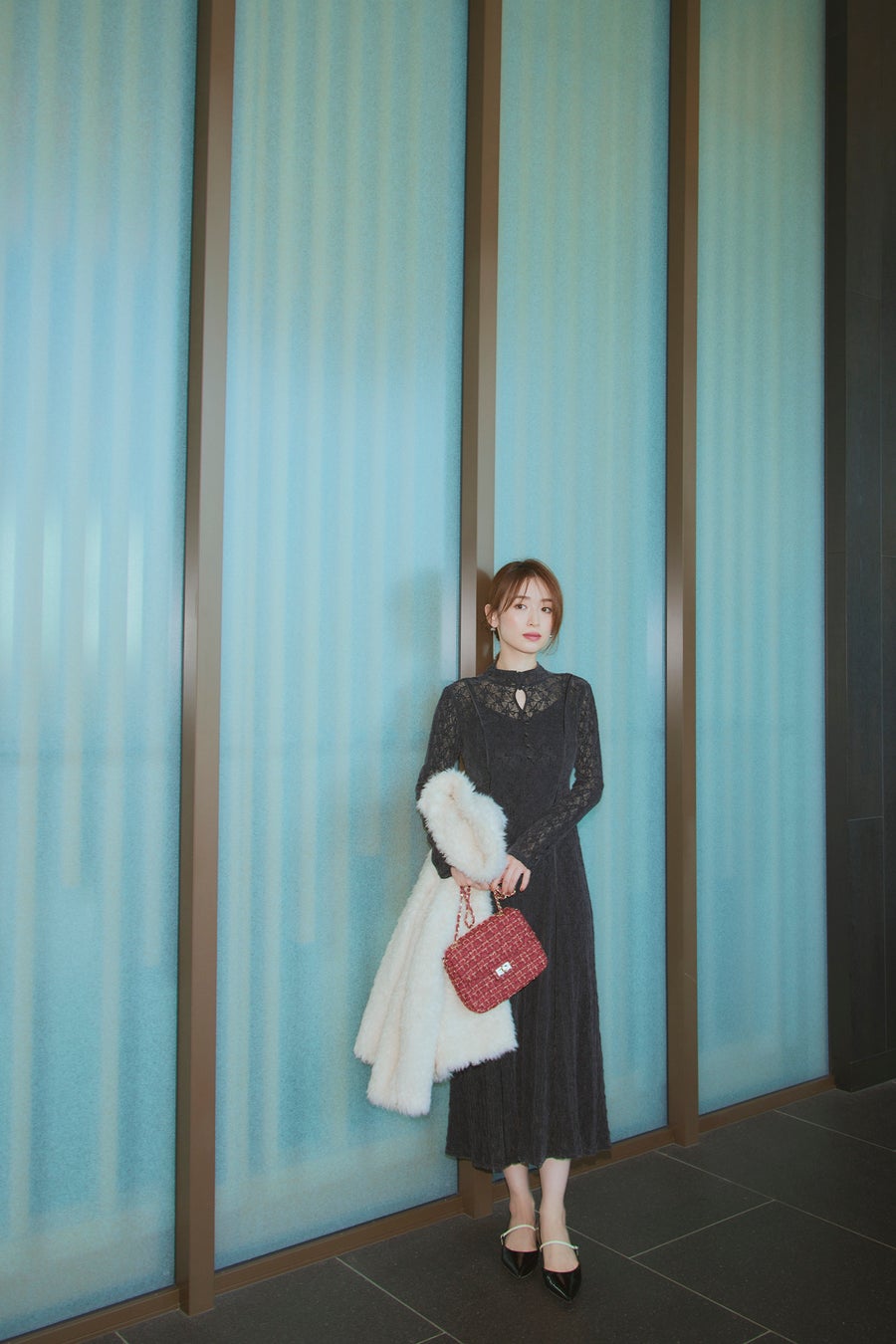 Knit dress【Online Store・ルミネ新宿2店 限定】 ¥26,400 / Earrings ¥10,340 / Ring ¥6,600 / Bag【Online Store限定】 ¥13,640 / Shoes ¥24,200