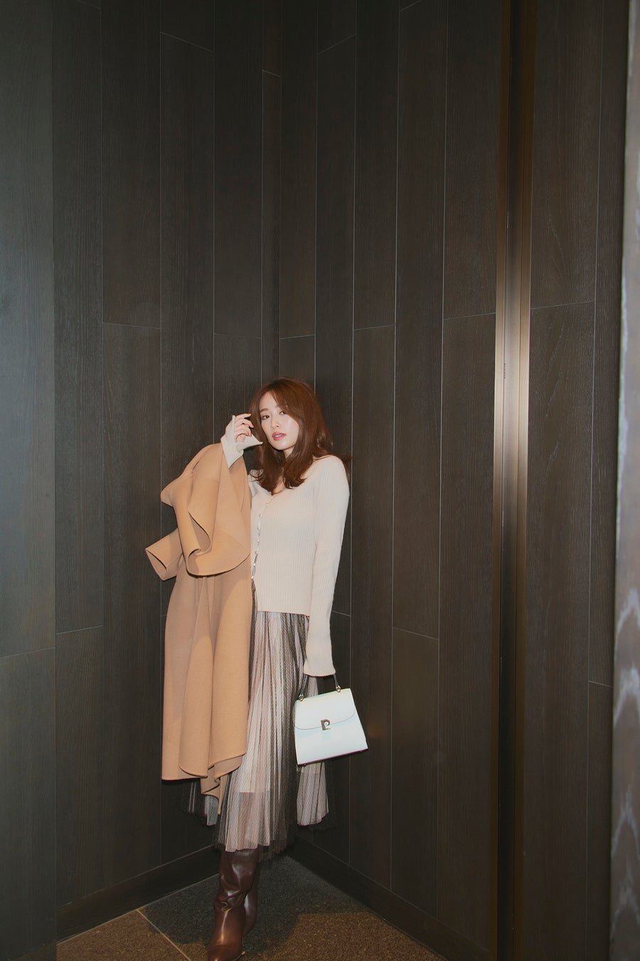 Coat ¥49,500 / Knit dress ¥26,400 / Earrings ¥10,340 / Bag ¥39,600 / Shoes ¥24,200