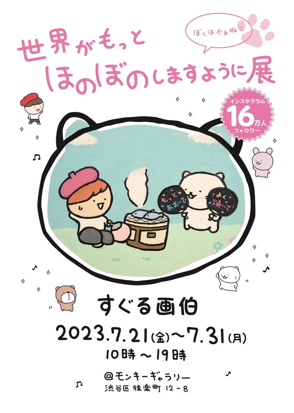 初の個展となる「世界がもっとほのぼのしますように展」では、これまでデジタルで作品を制作してきたすぐる画伯が、アクリル絵の具によるキャンバス画に挑み、描き下ろした30作品を展示・販売します。また、2022年からTwitterで発表を開始した四コマ漫画「ぼくはやぁねこ」の同人誌を発売。このほか書籍『ほのぼのザわーるど』に掲載した全125作品の複製キャンバス画を展示するほか、Tシャツやアクリルキーホルダー、マスコット、トートバッグといった関連グッズも販売します。また、毎日すぐる画伯本人が在廊し、人数限定の似顔絵イベントも開催する予定です。