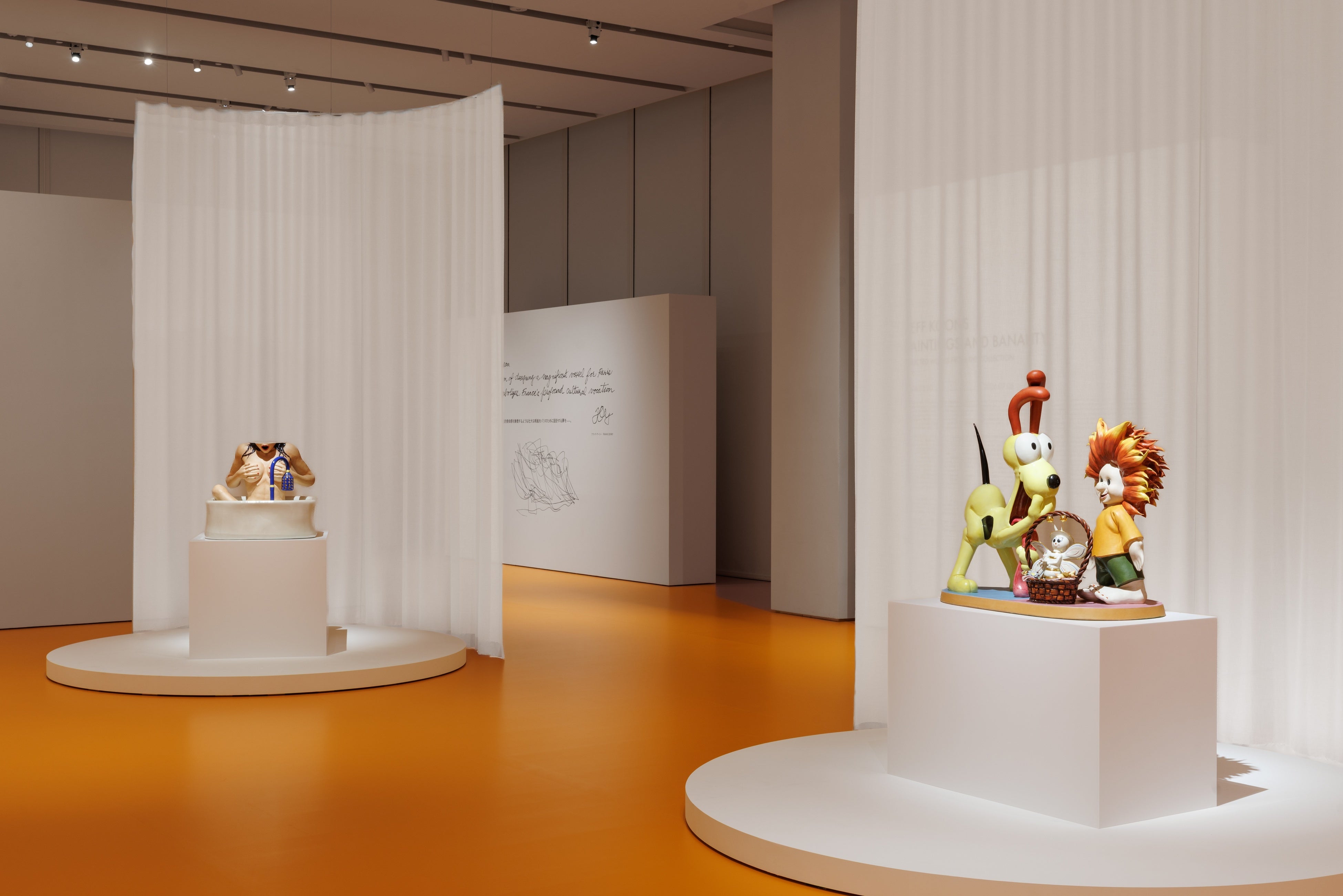 クーンズが頭角を現したのは1980年代半ばのことです。当時、彼は掃除機やカーペットクリーナー、あるいは本展にも出品されている《Three Ball 50/50 Tank》(1985年)のバスケットボールなど、工業製品や大量生産された消費財をガラスやプレキシガラスの ケースに収めて提示しました。彼は、「アメリカン·ドリーム」の象徴でもあるそれらの品々を、正真正銘の芸術作品へと昇華させたのです。その数年後、クーンズはこの手法をさらに発展させ、自ら「ありふれたオブジェ」を制作しはじめます。本展で紹介する《Woman in Tub》や《Wild Boy and Puppy》を含む1988年の「Banality」シリーズにおいて、彼はカートゥーンからの引用、ポップなイメージ、そして自身の記憶を融合させ、芸術、産業、大衆文化の境界を曖昧にする卓越した技巧の彫刻作品を 生み出したのです。