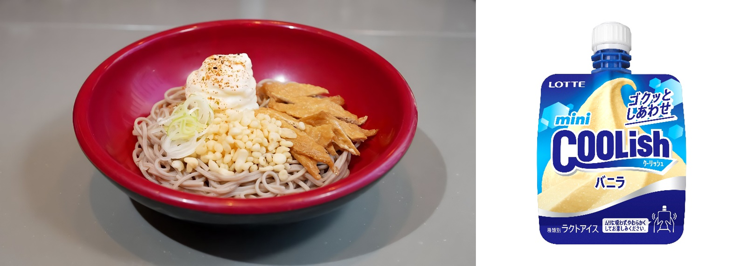 ロッテの“飲むアイス”「クーリッシュ」と名代富士そばの初となるコラボレーション商品です。夏の暑い時期にぴったりな「冷やしたぬきそば」に「ミニクーリッシュ バニラ」をトッピングするメニューです。