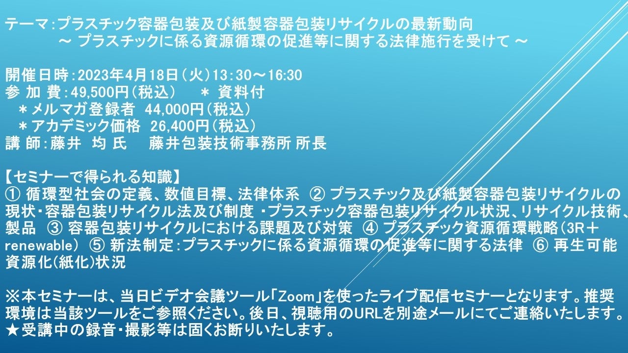 先端技術情報や市場情報を提供している(株)シーエムシー・リサーチ(千代田区神田錦町: https://cmcre.com/ )では、 各種材料・化学品などの市場動向・技術動向のセミナーや書籍発行を行っておりますが、 このたび「プラスチック容器包装及び紙製容器包装リサイクルの最新動向 ~ プラスチックに係る資源循環の促進等に関する法律施行を受けて ~」と題するセミナーを、 講師に藤井 均 氏 (藤井包装技術事務所 所長)をお迎えし、2023年4月18日(火)13:30より、 ZOOMを利用したライブ配信で開催いたします。 受講料は、 一般:49,500円(税込)、 弊社メルマガ会員:44,000円(税込)、 アカデミック価格は26,400円(税込)となっております(資料付)。