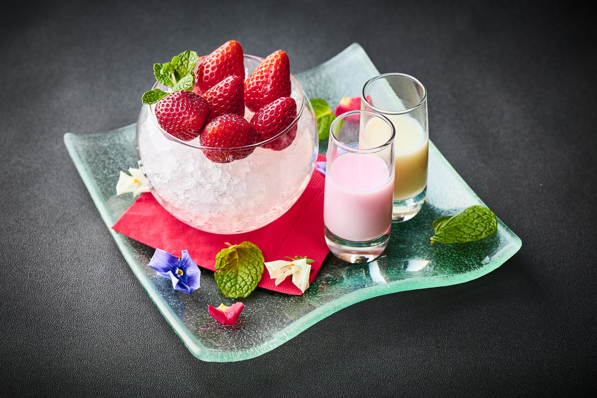 【紅ほっぺ・やよいひめ・あまおう】の3種類の苺の食べ比べをお楽しみいただけるアソートをご用意いたします。お好みで自家製の練乳ライチシロップや練乳さくらシロップのソースと合わせてご堪能ください。